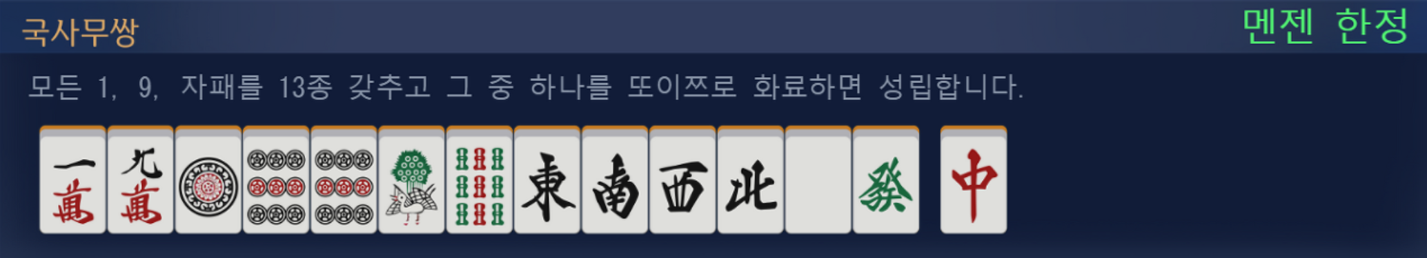 국사무쌍(国士無双): 모든 1ㆍ9ㆍ자패를 13종 갖추고 나서 하나를 또이쯔로 만들면 성립.