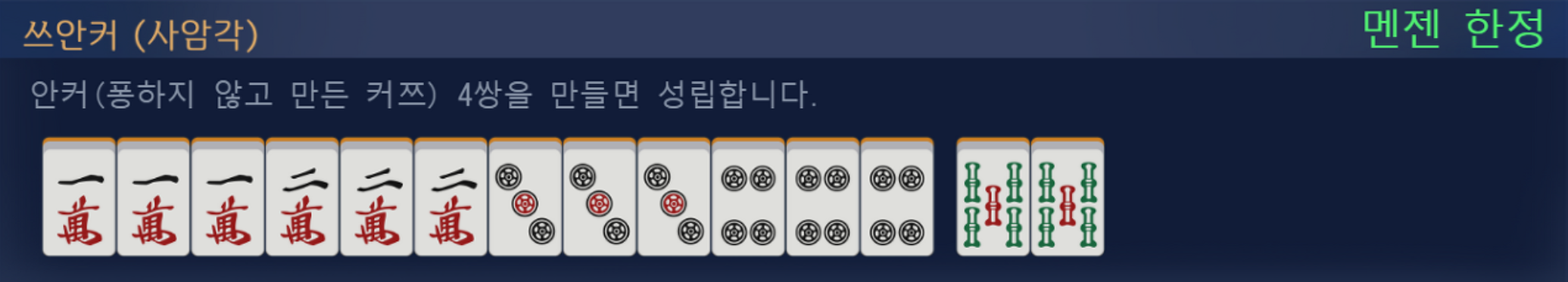 사암각(쓰안커, 四暗刻): 안커(자신의 패로 만듦) 4쌍을 만들면 성립.