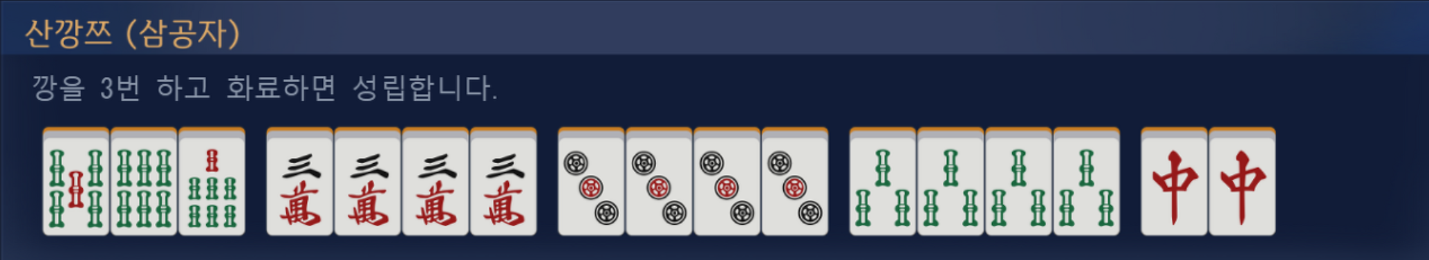 삼공자(산깡쯔, 三槓子): 깡을 3번하고 화료하면 성립.