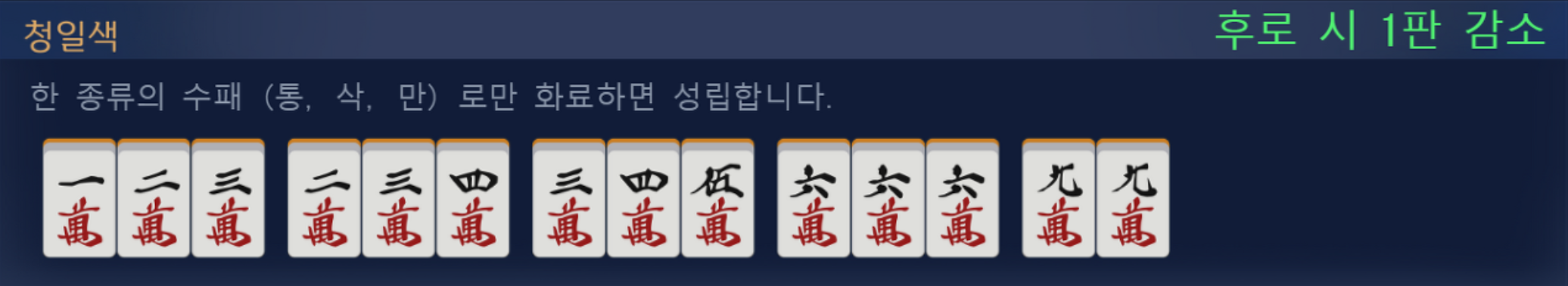 청일색(清一色): 한 종류의 수패로만 화료하면 성립.