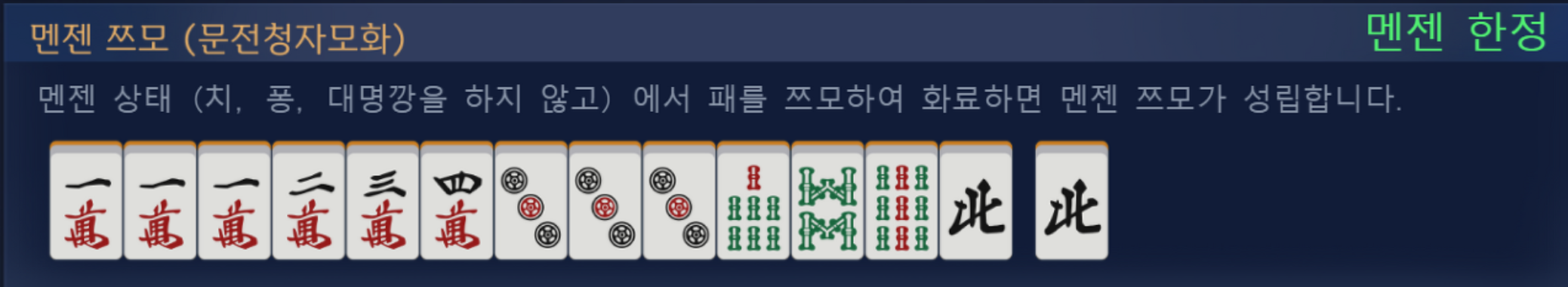 | 멘쯔(面子) | ● 남의 패를 가져오는 ‘치(吃, 슌쯔를 만들러 가져오는 경우)’, ‘펑(碰, 커쯔를 만들러 가져오는 경우)’, ‘깡(槓, 4개의 패를 만든 경우)’을 하지 않은 상태로 이기는 경우 ● 족보에 없어도 용을 만든 경우 화료 가능. |