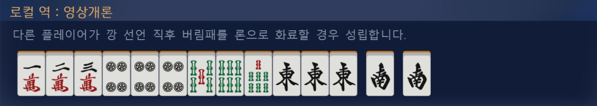 | 론(ロン) | 텐파이 상태일 때 상대가 버린 패로 이길 수 있을 때 선언 가능. |