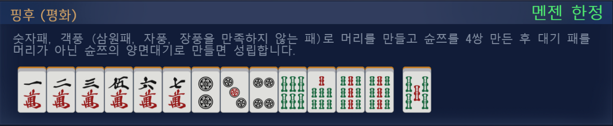 평화(핑후, 平和): 슌쯔를 4쌍 만든 후 대기패를 몸통의 양면대기로 만들면 성립.