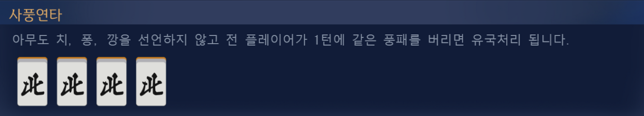 사풍연타(四風字聯打): 누구도 울지 않았을 때 모든 사람이 1턴에 같은 방위패를 버릴 때.