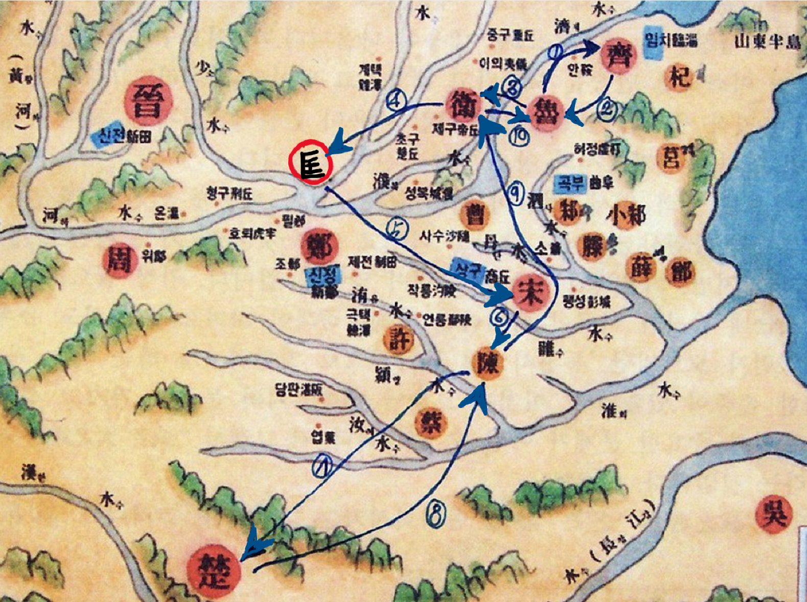 ※ 협곡(夾谷)의 만남을 통해 제(齊)와 노(魯)가 우호 맺음, 양호(陽虎)는 제(齊)⇒송(宋)⇒진(晉)으로 망명함.