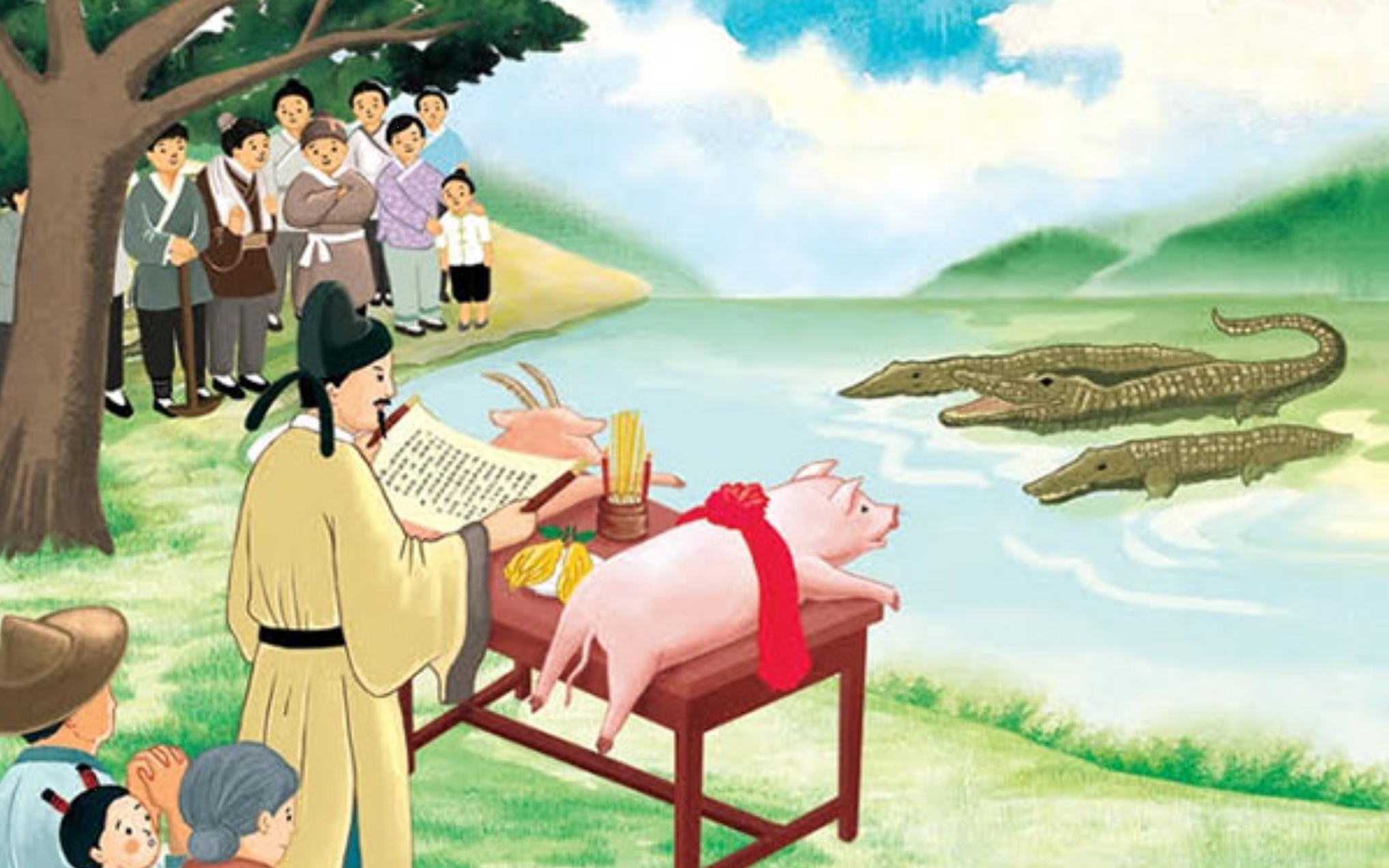 ○ 公守潮州, 問民疾苦. 皆曰: “惡溪有鰐魚, 食民畜産且盡, 民以是窮.” 數日, 公自往視, 令其屬奏濟, 以一羊一豕投溪, 與魚食而告之以文. 是夕, 暴風震雷起溪中. 數日水盡涸, 西徙六十里, 自是潮無鰐魚患..