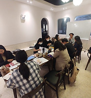 확실히 카페에서 하는 스터디는 강의실에서 하는 스터디와 느낌이 다르다. 느낌이 다르게 느껴지는 이유는 크게 두 가지가 있는 것 같았다. 첫째는 공간이 지닌 느낌 자체가 다르다는 것이다. 강의실은 애초에 배움을 전제로 만들어진 공간이다. 그러니 ‘잘 배워야 한다’는 중압감이 작용하기 마련이지만 카페는 그렇지 않다. 편안하게 차를 마시며 담소를 나누는 공간이기에 맘이 저절로 누그러지는 것이다. 둘째는 도구의 배치에 있다. 강의실의 책걸상은 칠판을 향해 있기 때문에 가르치는 사람과 배우는 사람이 현격하게 나누어지게 된다. 물론 책걸상의 배치를 바꿔서 동그랗게 만들 수도 있지만 시간이 들고 품이 들기 때문에 애써 그렇게까지 하진 않는다. 그에 반해 이곳은 아예 스터디를 할 수 있도록 만들어진 공간답게 중간에 긴 테이블이 놓여 있고 그곳에 우리들은 옹기종기 모여앉아 이야기를 나누면 된다. 그러니 일방적이라기보다 상방적인 느낌이 강하게 들며 자연스럽게 의사를 주고받게 된다.