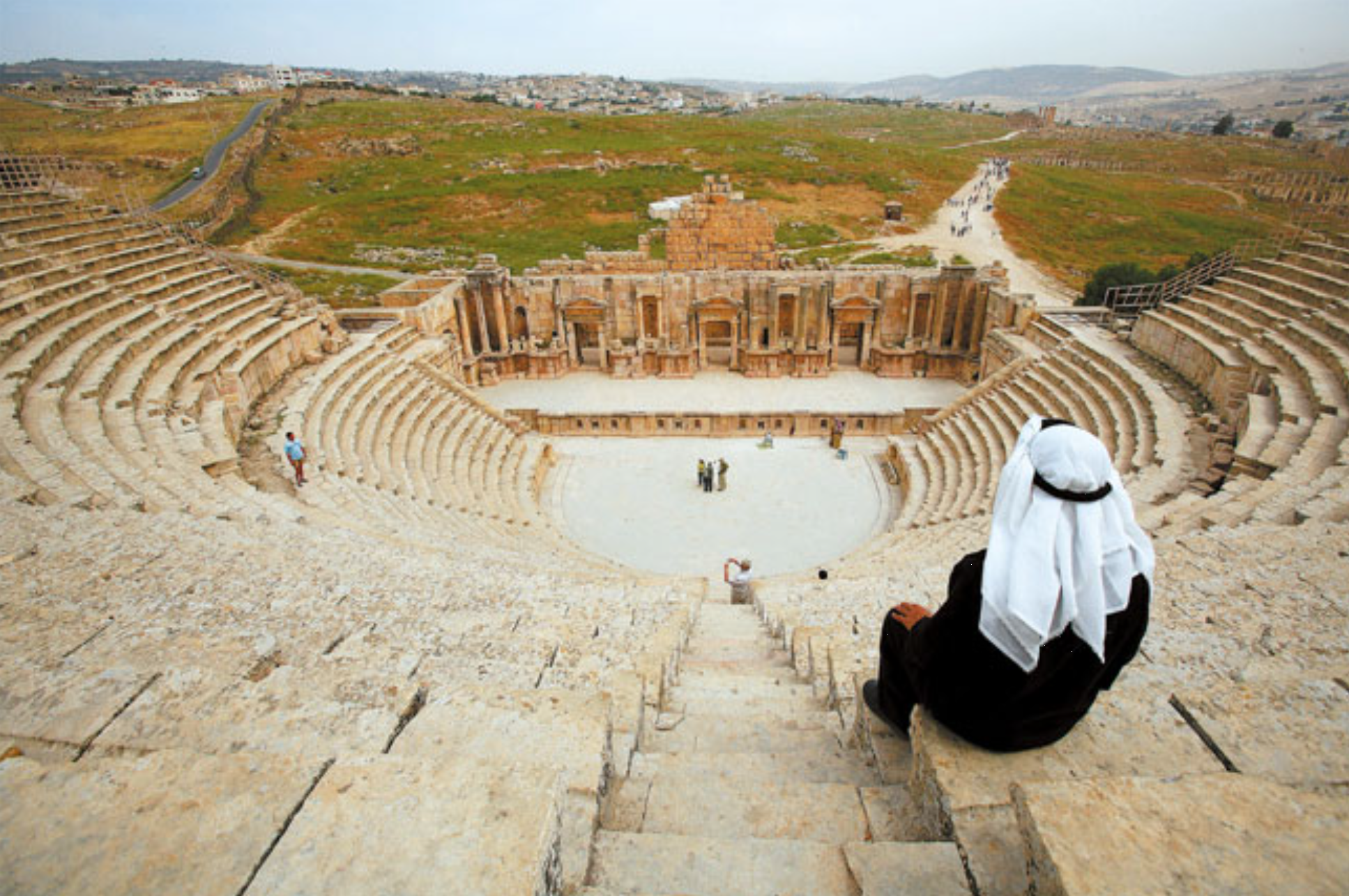 저 밑에 세 사람이 서있는 곳에서 이야기를 하면 전체 5000명 관객석에 거의 동일한 음향으로 울려 퍼진다. 당시는 야외리도 소음 데시벨 수준이 낮았던 데다가 좌석 밑이 공명 튜브 역할을 하여 놀라운 음향효과를 낸다. 저 밑의 둥근 바닥을 오케스트라(orkhestra)라고 하는데 그곳이야말로 코러스와 춤 공연이 이루어지는 주무대였다. 우리가 아는 무대는 프로스케니온(proskenion)이라고 부르는데 무대장치가 주로 그곳에 설치되었다. 그러다가 점차 현대적 개념의 부대로도 사용되었다. 이곳은 예수가 다녔던 데가볼리 10개 도시 종의 하니 제라시(Jerash), 놀랍게 화려한 폴리스이다. 야곱이 이스라엘이라는 명칭을 얻는 얍복강 위로 있다. 제라시에 관해서는 다음 편에 다시 해설된다.