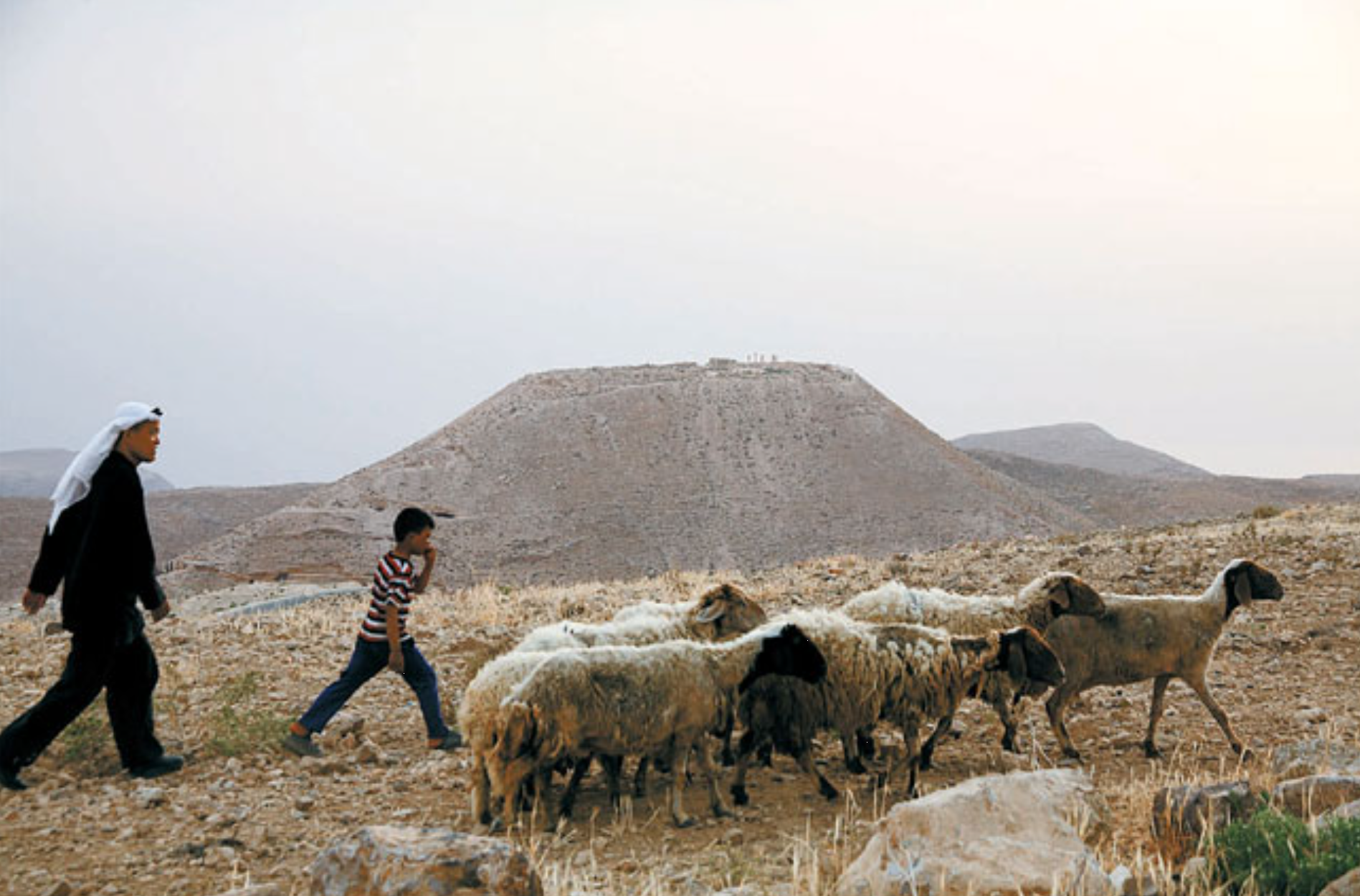 ▲ 멀리 바리보이는 것이 현재 요르단에 속해있는 마캐루스 성채의 전경이다. 목동 머리 바로 앞 부분에 꺼먼 검이 보이는데 그 부분이 바로 세례요한이 같혔던 지하 동굴감옥이다. 저 산 너머로 옥빛의 사해가 건개되고, 또 사해 건너편 유대광야에 마사다 요새가 있다.