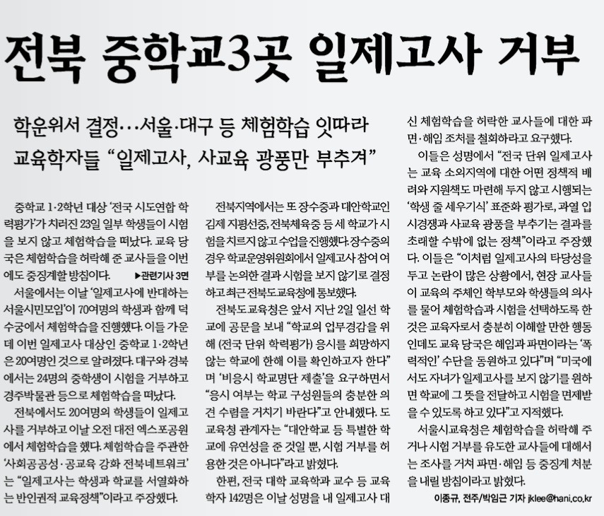 어제 중학교 1, 2학년을 대상으로 전국 일제고사가 치러졌다. 10월에 치러진 일제고사에서 현장 체험학습을 떠나보냈다는 이유로 8명의 교사가 해임된 사건이 있었던 터라 이번에도 어떤 불상사가 생기지나 않을까 관심이 집중될 수밖에 없었다. 취업도 어려운 시기임을 감안할 때 해직이라는 극단적인 조치는 소신을 약하게 만들기에 충분하다. 더욱 가정이 있는 사람이라면 더 말할 필요도 없을 것이다. 국가라는 실체는 보이진 않지만 개개인의 소신과 생각마저도 어느 계층의 이익을 위해서 철저히 봉사하고 종속되도록 만든다. 이런 상황에서 어제 치러진 일제고사에서도 몇 몇 학생은 체험 학습을 떠났고 전북의 세 학교는 시험을 치르지 않고 수업을 했다. 아래에 보이는 사진은 극명하게 갈린 일제고사에 대한 두 상황을 보여준다. (한겨레 신문, 일제고사 사진과 촛불집회하는 사진을 동시에 보여줌)