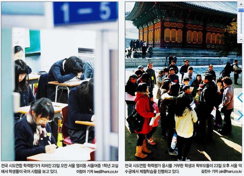 ▲ 일제고사를 보는 학생들과 부당함에 맞서는 학생들.