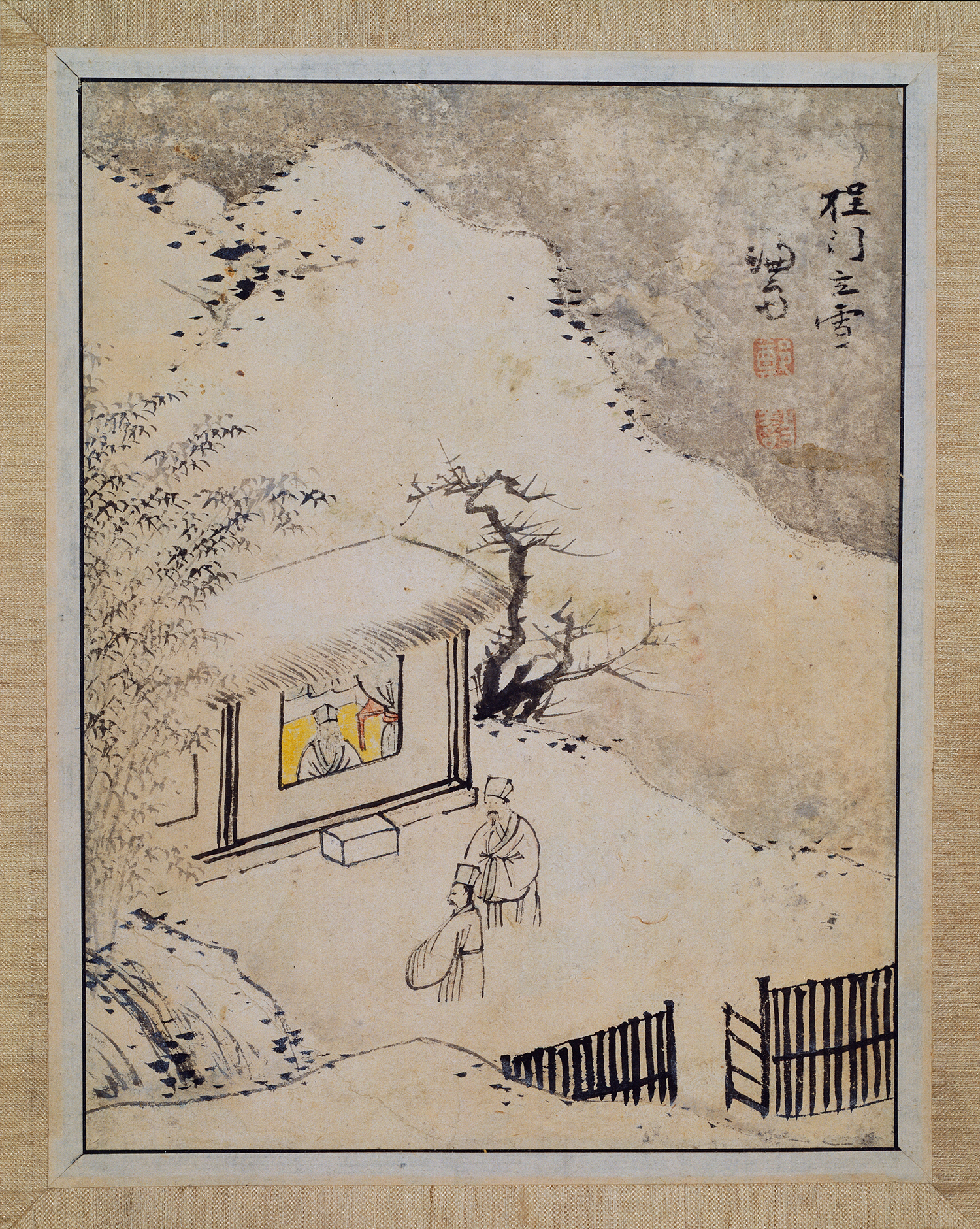 | 교사 : 이 작품에 대해 조사한 내용을 발표해 볼까요? 정우 : 이 그림은 겸재 정선의 작품으로, 스승에 대한 존경과 배움의 의미를 담고 있습니다. 영주 : 중국 송나라 때 정이(程頤)를 뵈러 갔던 두 제자가 사색에 잠긴 스승을 방해하지 않으려고 눈이 내리는 집 밖에서 오랫동안 기다렸다는 이야기를 소재로 한 그림입니다. 그래서 마당에 서 있는 제자들의 하반신을 눈에 파묻혀 보이지 않게 묘사했습니다. 재용 : 스승 정이의 집 앞에서 눈을 맞으며 서서 기다리는 장면을 그렸기에 ‘程門立(㉠)圖’라고 합니다. |