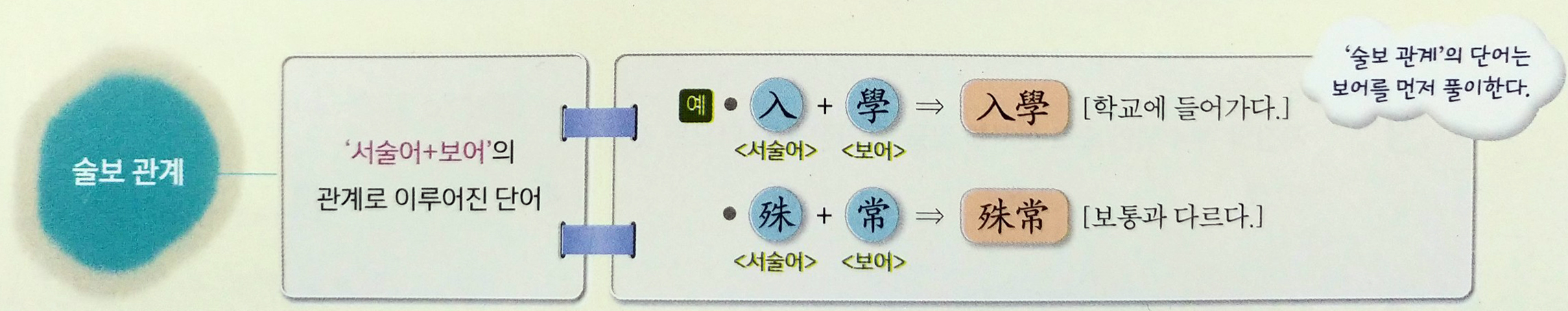 술보 관계는 서술어와 보어(補語)의 관계로 이루어진 단어이다. 서술어는 동작, 행위, 상태 등을 나타내고, 보어는 서술어를 보충하여 부족한 뜻을 완전하게 해준다. 보어를 먼저 새기고, 서술어를 나중에 새긴다. 술보 관계의 단어도 어순이 우리말과는 다르다.