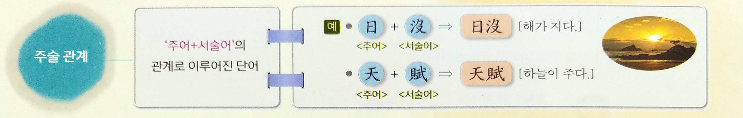주술 관계는 주어(主語)와 서술어(敍述語)의 관계로 이루어진 단어이다. 서술어는 주어에 대해 진술하는 내용을 나타내고, 주어는 서술어의 진술을 받는 대상이 된다. 주어를 먼저 새기고, 서술어는 나중에 새긴다. 술목 관계는 서술어와 목적어의 관계로 이루어진 단어이다. 서술어는 동작이나 행위 또는 소유를 나타내고, 목적어는 그 대상이 된다. 목적어를 먼저 새기고, 서술어를 나중에 새긴다. 술목 관계의 단어는 어순(語順)이 우리말과 다르다. 술보 관계는 서술어와 보어(補語)의 관계로 이루어진 단어이다. 서술어는 동작, 행위, 상태 등을 나타내고, 보어는 서술어를 보충하여 부족한 뜻을 완전하게 해 준다. 보어를 먼저 새기고, 서술어를 나중에 새긴다. 술보 관계의 단어도 어순이 우리말과는 다르다. 수식 관계는 수식어(修飾語)와 피수식어(被修飾語)의 관계로 이루어진 단어이다. 수식어는 피수식어의 성격에 따라 명사류를 수식하는 것과 동사류를 수식하는 것이 있다. 병렬 관계는 성분이 같은 말들이 나란히 놓여 이루어진 단어이다. 이에는 서로 상대되는 의미를 가진 한자가 나란히 놓여 이루어진 경우와 서로 비슷한 의미를 가진 한자가 나란히 놓여 이루어진 경우가 있다. 단, 단어의 짜임을 학습할 때에는 용어나 상호 관계를 도식적으로 강조하는 식의 문법 중심 학습에서 벗어나, 다양한 용례를 통하여 단어를 바르게 이해하고 풀이하는 방법을 익히도록 해야 한다.