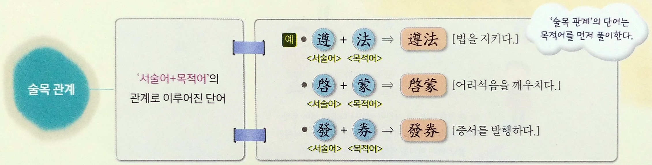 술목 관계는 서술어와 목적어(目的語)의 관계로 이루어진 단어이다. 서술어는 동작이나 행위 또는 소유(예: 有, 無)를 나타내고, 목적어는 그 대상이 된다. 목적어를 먼저 새기고, 서술어를 나중에 새긴다. 술목 관계의 단어는 어순(語順)이 우리말과 다르다.