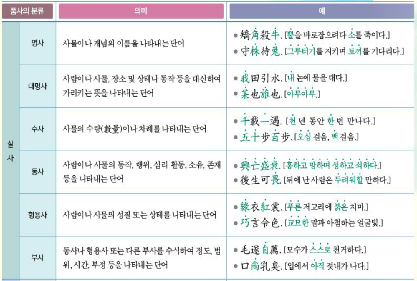 • [12한문01-04] 이 성취기준은 기본 품사를 이해하여 실사와 허사의 차이를 구별하고 단어, 성어, 문장의 풀이에 활용하는 능력을 기르기 위해 설정하였다. 품사에는 단독으로 어휘적 의미를 가진 ‘실사’와 문법적 의미만을 나타내는 ‘허사’가 있다.
