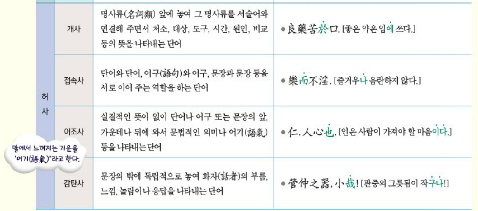 허사에 속하는 품사로는 개사, 접속사, 어조사, 감탄사가 있다.