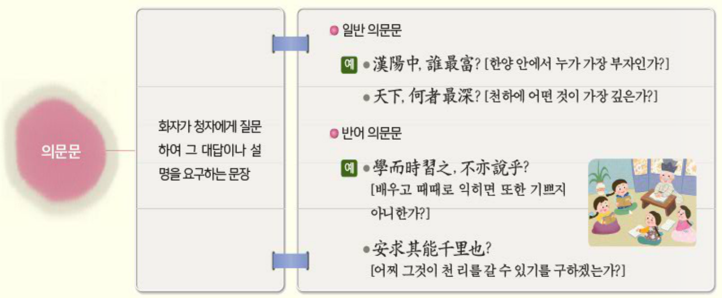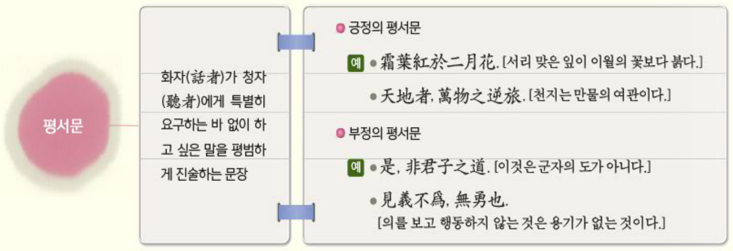 [12한문Ⅰ02–03] 문장의 유형은 문장을 일정한 기준에 의거하여 분류한 것이다. 문장의 유형을 화자(話者)가 나타내는 어기(語氣)를 기준으로 나누면 평서문(平敍文), 의문문(疑問文), 명령문(命令文), 감탄문(感歎文) 등으로 분류할 수 있다.