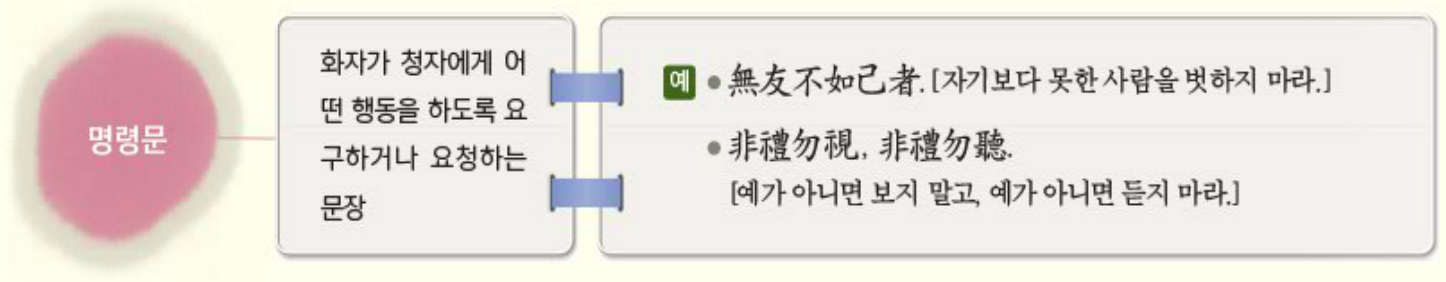 화자(話者)가 청자(聽者)에게 어떤 행동을 하도록 요구하거나 요청하는 문장이다. ‘勿, 無, 請’ 등 금지 또는 요청의 뜻을 나타내는 말이 같이 쓰이는 경우가 많다.