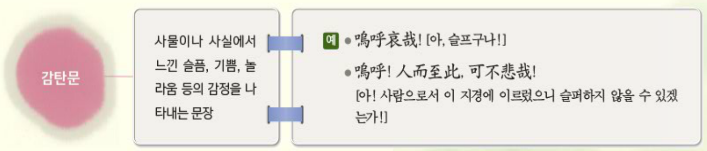 사물이나 사실에 느낌을 받아 슬픔, 기쁨, 놀라움 등의 감정을 나타내는 문장이다. 문장 앞에 감탄사인 ‘嗚呼’, ‘噫’ 등의 감탄사를 사용하거나 ‘乎’, ‘哉’ 등 감탄의 어기를 나타내는 어조사를 문장 끝에 사용한다.