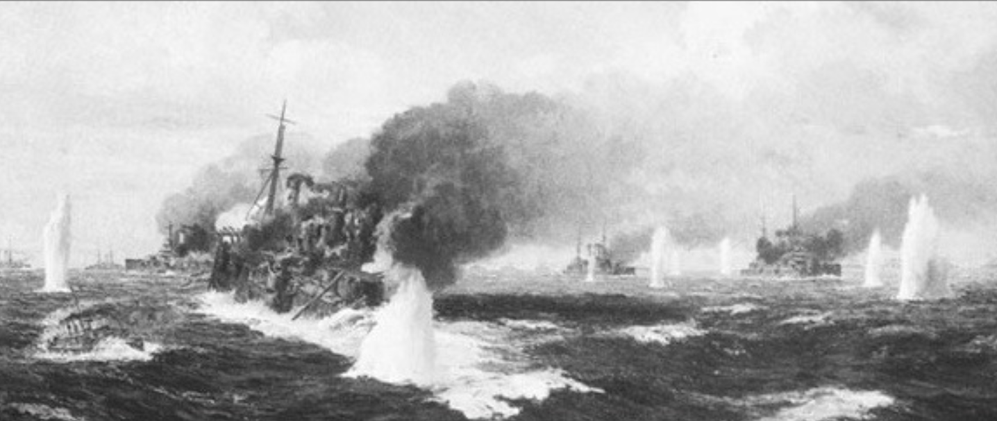 ▲ 1905년 5월 27일 대한해협에서 일본 연합함대의 집중포격을 받고 침몰하는 발틱함대의 전함을 사실적으로 기록한 기록화.