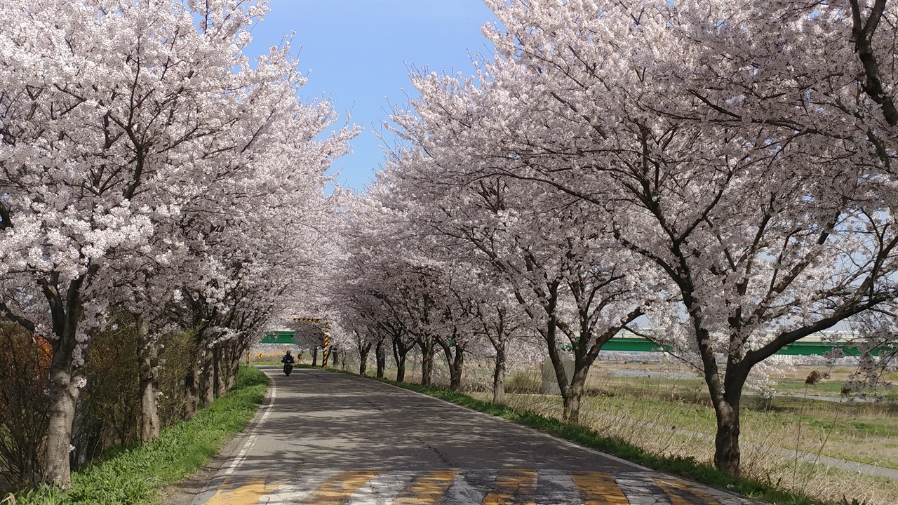 ▲ 전군간 도로에 핀 벚꽃. 일본은 이곳을 통해 애써 지은 쌀을 수탈했다. 벚꽃이 이곳에 심어진 이유도 거기에 있다.