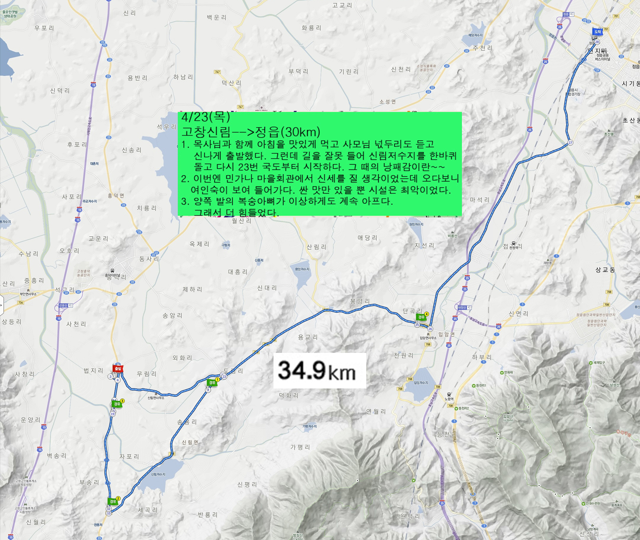 고창 신림교회에서 정읍까지는 20km 약간 넘는 거리다. 어제와 그제 30km가 넘는 거리를 무리하며 걸었기 때문에, 오늘만큼은 좀 여유롭게 걸어볼 생각이다. 그래서 정읍을 오늘의 목적지로 정하였다.