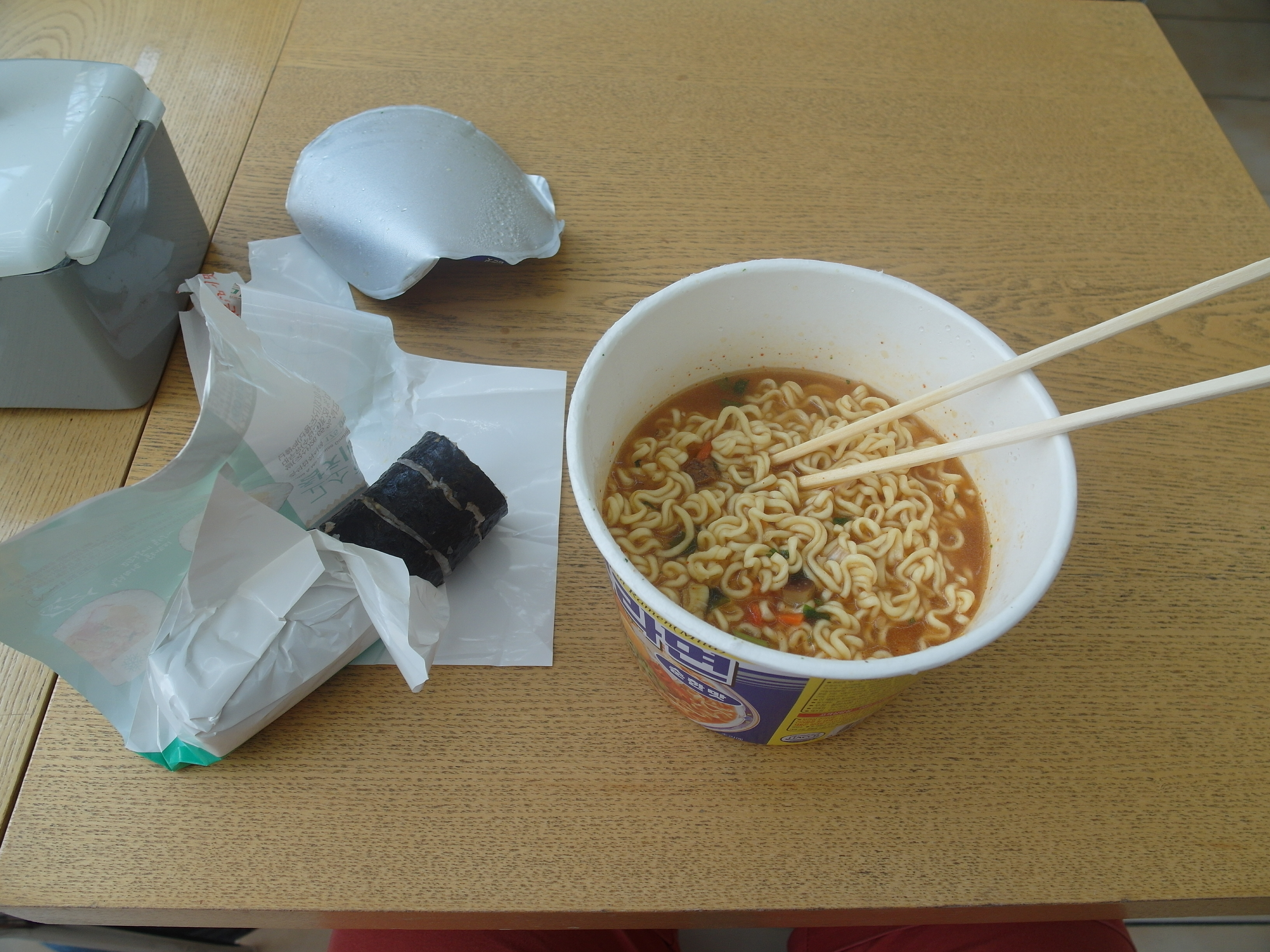 시간은 어느덧 8시가 넘어가고 있었다. 그래도 정읍은 역 주변이 나름 변화한 곳이었기 때문에 바로 편의점이 보이더라. 그곳에서 김밥과 라면을 먹었다. 라면과 김밥은 임용을 준비하던 때에 나에게 어떤 것에도 비할 수 없는 특별식이었다. 늘 도시락을 싸서 다녔는데, 그게 물릴 때쯤 거금 2500원 정도(?)를 지출하여 만찬을 즐기곤 했다. 왕뚜껑 짬뽕과 김밥을 함께 사서 먹고 있노라면 세상 그 어느 것에도 비할 수 없는 행복이 느껴졌다. 지금이라 해서 달라진 건 없으니, 아침 식사치고는 만찬에 가깝다고 할 수 있다. 오랜만에 아침부터 호사를 누려본다.