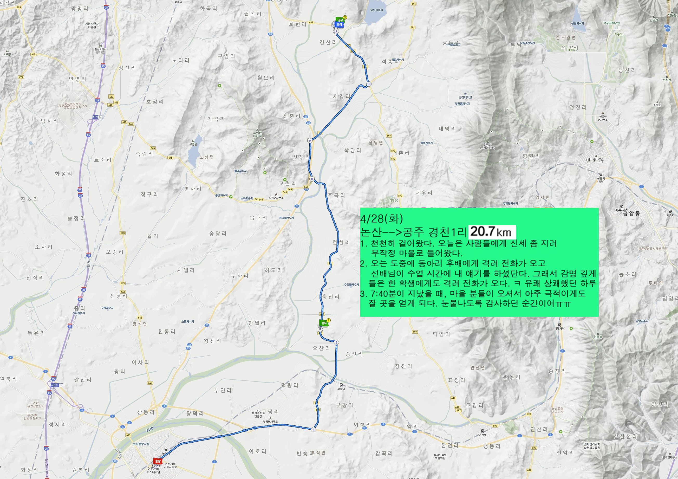 논산 시내 인접지역은 대라 차들도 많이 다녀서 천천히 걸어서 지나가야 했다. 그러다 691번 지방도로 접어드니 좀 한산해지더라. 그쯤에선 아침밥을 먹어도 될 거 같아서 도로가에 자리를 잡고 앉았다.