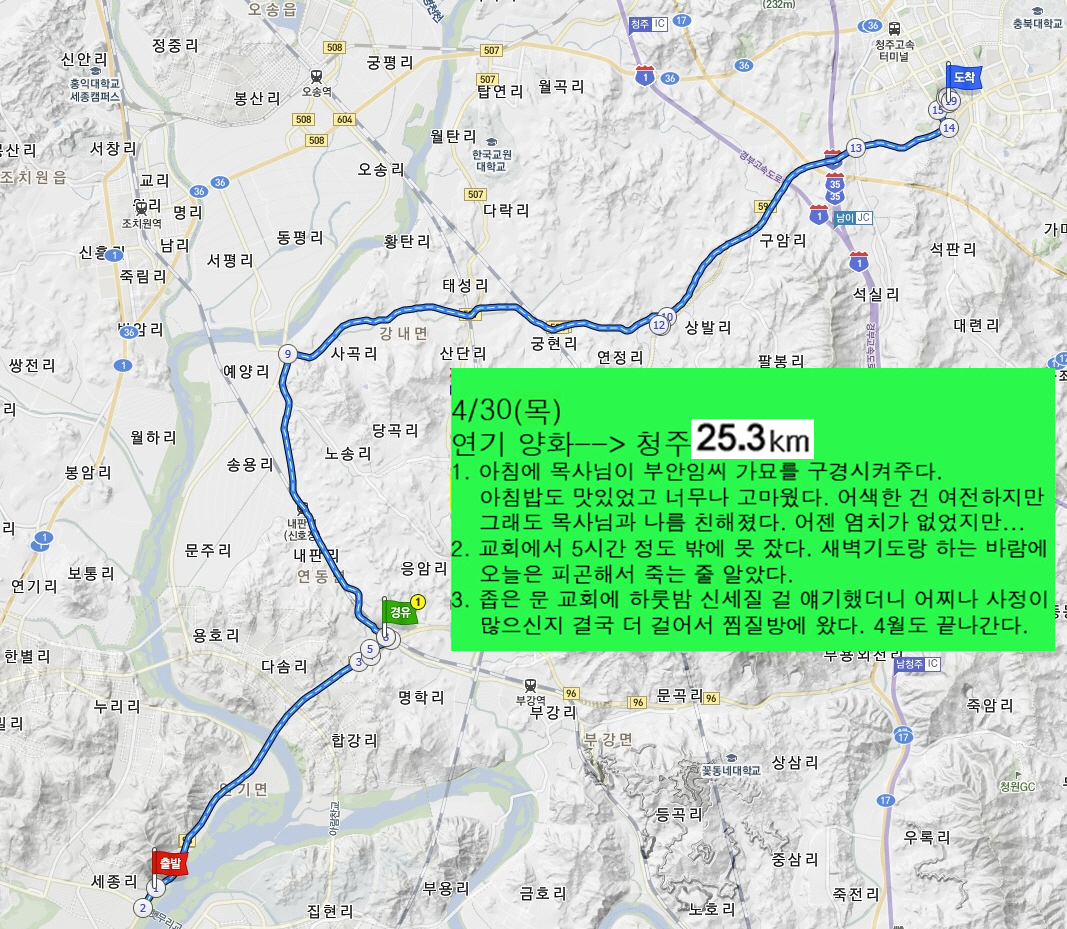 목사님은 아들을 학교까지 태워다 준다며 나에게 같이 나가자고 하셨다. 한 번도 본 적 없는 사람을 사택에 자게 해준 것도 감사한데, 그렇게 챙겨주기까지 하니 얼마나 행복하던지. 그 덕에 연기군 일대를 실컷 구경할 수 있었다.