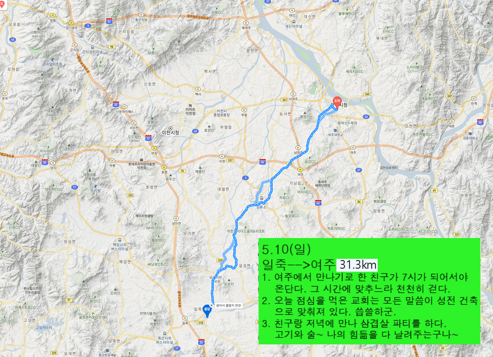 하지만 그런 계획을 세우고 있을 때 친구를 만났다. 이 친구는 내가 국토종단 할 수 있도록 의미부여도 해주고 힘까지 팍팍 북돋워주던 친구다. 그런데 그때 “어느 경로로 어떻게 가냐? 혹시 여주로 오게 되면 연락해. 내가 맛있는 저녁 사줄게~”라고 말하는 거다. 그래서 알았다고 대답했다.