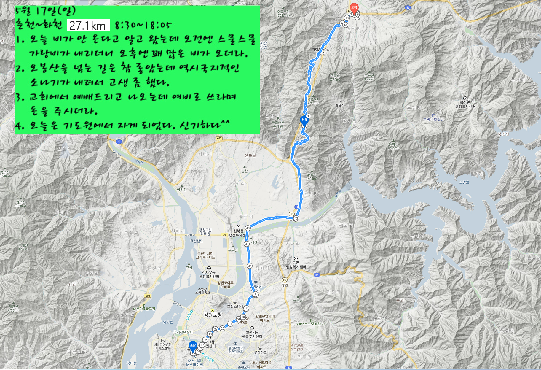그런데 오늘은 연거푸 두 번이나 제안을 받았다. 한번은 한림대 위치를 물었을 때였다. 알려준 대로 따라가고 있는데 그 사람이 뒤에서 차를 타고 오더니 타라고 하는 것이다. 또 한 번은 교회에서 점심을 먹고 나올 때였다. 갑자기 비가 내리기에 우의를 주섬주섬 챙겨 입고 있는데 그곳을 지나던 어떤 사람이 어디까지 가냐고 묻고선 태워주시려 하는 거였다. 두 번 다 한적한 도로가 아닌 주택가 길이었다. 차를 타고 가면 여행 룰(rule)에 위배된다고 정중히 사양했다. 막상 이런 제안을 받으니깐 기분은 좋더라.