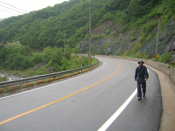 어느덧 시간은 7시 10분을 넘어가고 있었다. 산 속이고 비 오는 날인지라 해도 빨리 져서 벌써부터 어둑어둑하다. 나는 아까부터 차 진행방향과 같은 방향으로 걷고 있다. ‘차와 반대 방향으로 걸어가라’는 ‘여행의 제1규칙’을 깬 것이다. 여차하면 차를 잡아타고 간성으로 갈 생각이기 때문에 그렇게 한 것이다.