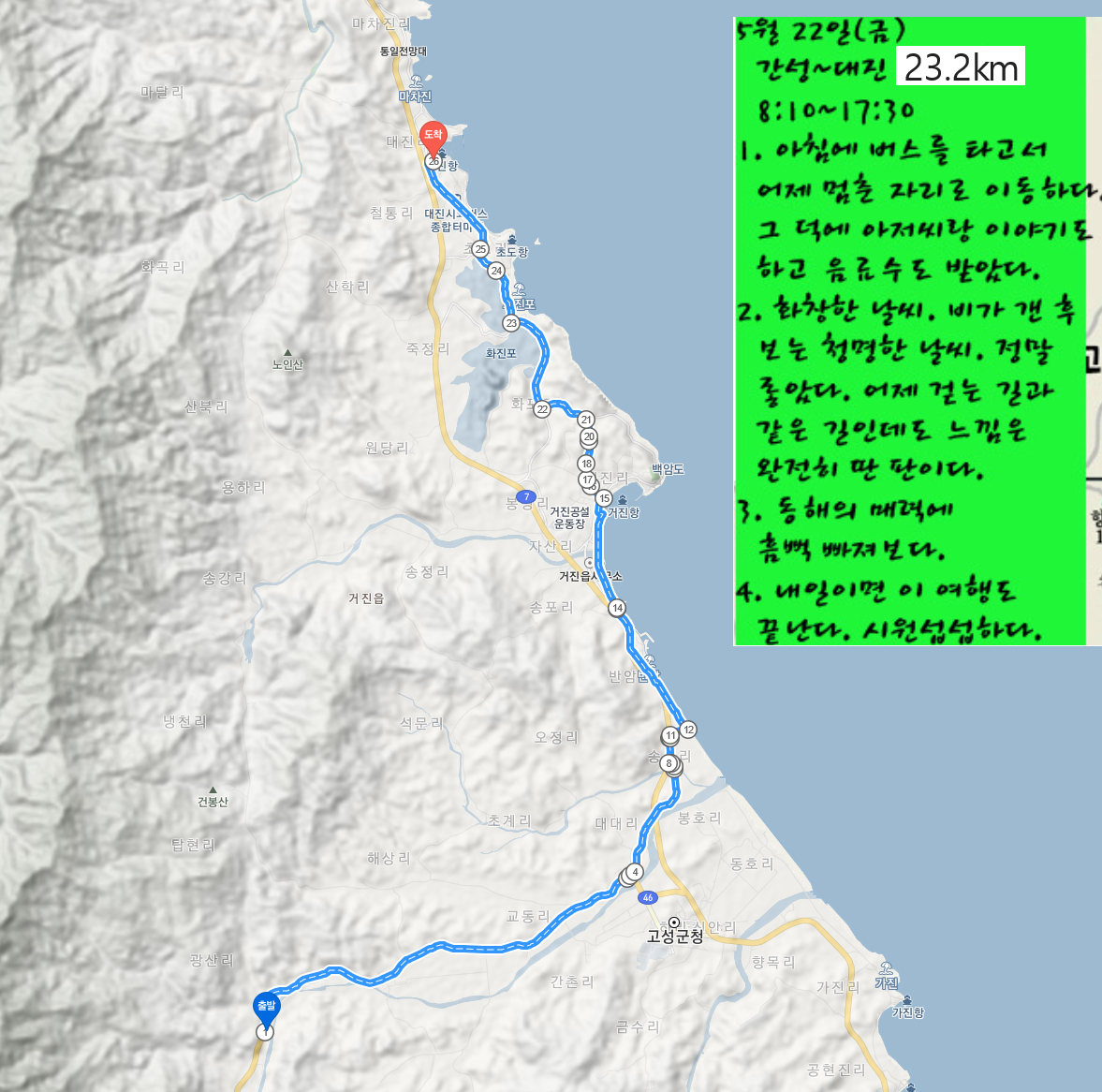 아침에 일어날 때만 해도 택시를 잡아타고 그 지점으로 갈 생각이었다. 그런데 막상 택시 기사님에게 어떻게 설명해야 할지 난감하더라. “간성 9Km라는 팻말이 보이는 곳까지 가주세요”라고 하기엔 이상하니 말이다. 곰곰이 생각하는 데도 좋은 방법이 생각나지 않더라.
