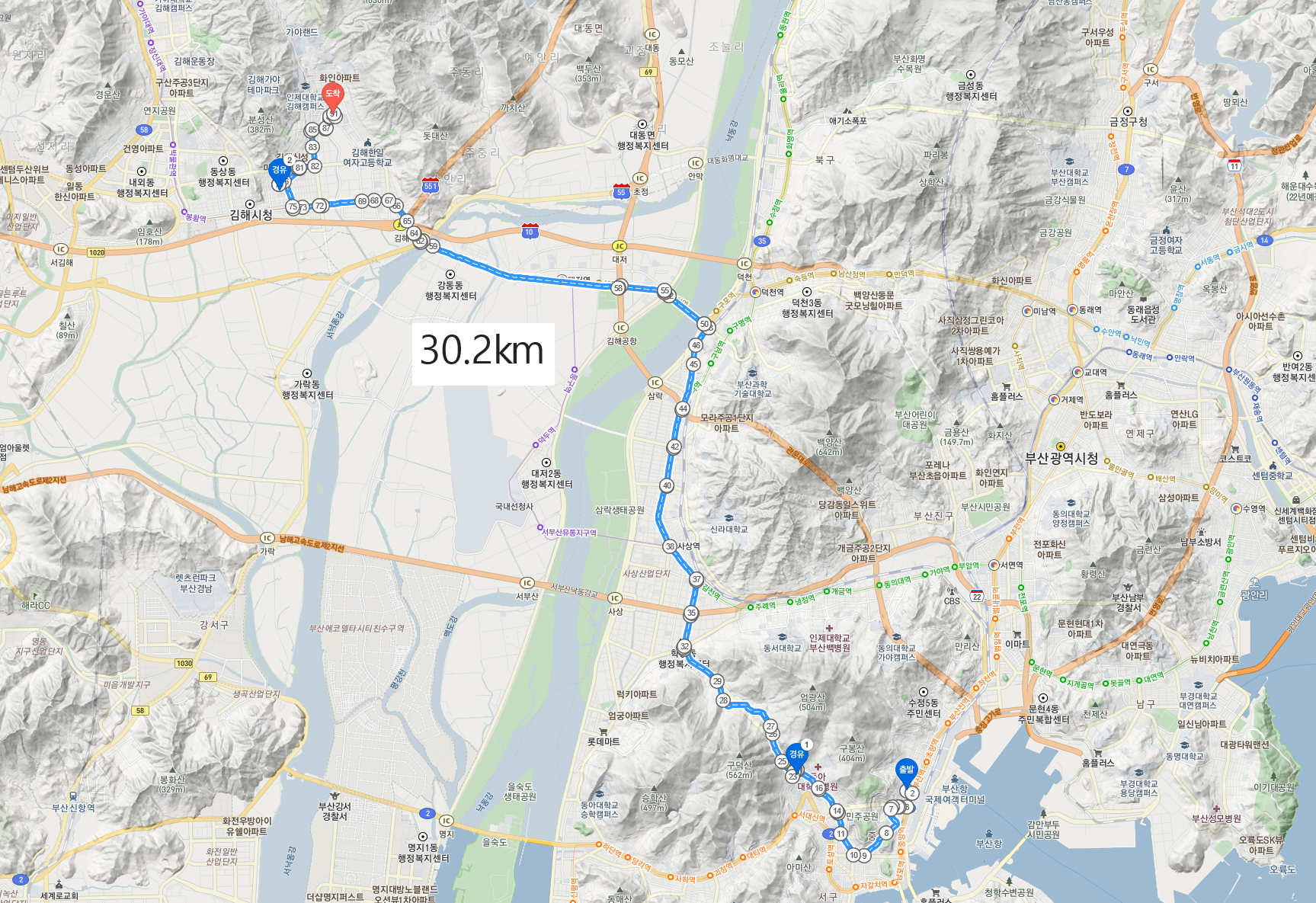 그렇지 않아도 부산이 하도 도로 사정이 복잡한 터라 어떻게 빠져나갈까 걱정하고 있었던 터였는데, 이렇게 순식간에 해결되니 기분은 덩달아 좋아졌다. 아저씨는 자세한 경로를 알려주시기보다 ‘영주터널→구덕터널→사상→구포다리→김해’와 같이 지나가야 하는 주요 경로만을 알려주셨다. 그러니 이 경로에 따라 사람들에게 물어가며 찾아가기만 하면 되는 것이다. 이제부턴 지도에 집중하기보다 잘 물어야 하고 설명해 주는 길을 제대로 찾아가야 헤매지 않고 부산을 벗어날 수 있다.