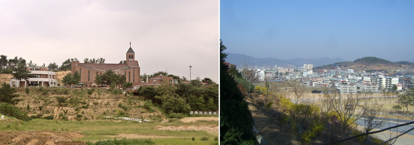 성당은 언덕 위에 위치해 있었다. 밀양 시내가 내려 보이는 명당자리다. 중세의 주거공간은 배산임수에 자리하고 있어 높은 고지대를 기피했던 반면, 서양의 경제적 합리주의는 높은 장소를 선호하는 듯하다.
