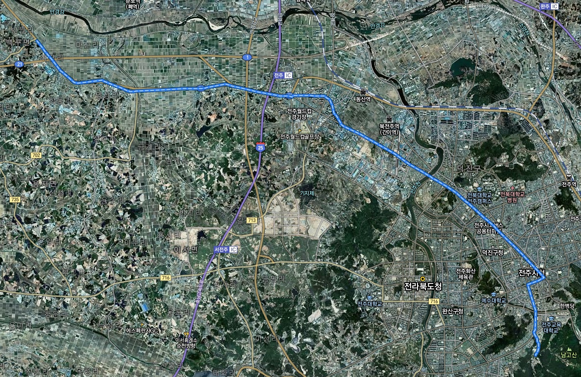 김제에 들어서니 빗방울이 굵어지고 또 낙뢰가 내리친다. 그럼에도 오늘 걸을 양이 많지 않고 여행의 마지막 날이었기에 쉬지 않고 최선을 다해 걸었다. 백구면에 들어서니 낯익은 버스가 서 있더라. 그건 바로 전주 시내버스였다. ‘이런 곳까지 시내버스가 다닐 줄이야’라는 반가운 마음으로 버스를 보고 있었다. 그렇게 경유지를 훑고 있는데 놀라 자빠지는 줄 알았다. 아니나 다를까 우리 집이 있는 ‘흑석골’로 곧장 가는 버스가 아닌가. 전주 시내에선 이 버스를 보기가 그렇게 힘들더니 여기에 떡하니 있으니 얼마나 신기했겠는가.