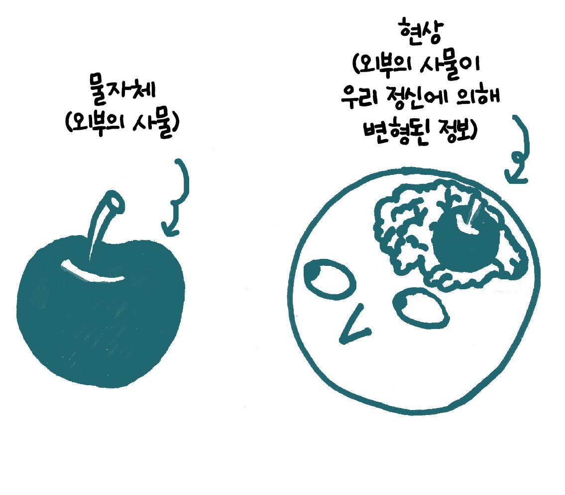 칸트는 우리가 사물을 인식하는 것은 사물에서 비롯된 감각 자료 혹은 관념일 뿐 사물의 본질은 아니라고 보았다. 우리는 사물의 전체를 아는 게 아니라 사물이 우리의 정신에 드러내 주는 현상만을 가지고 인식의 내용을 구성할 수밖에 없다. 그래서 우리의 인식은 현상계로 국한된다.