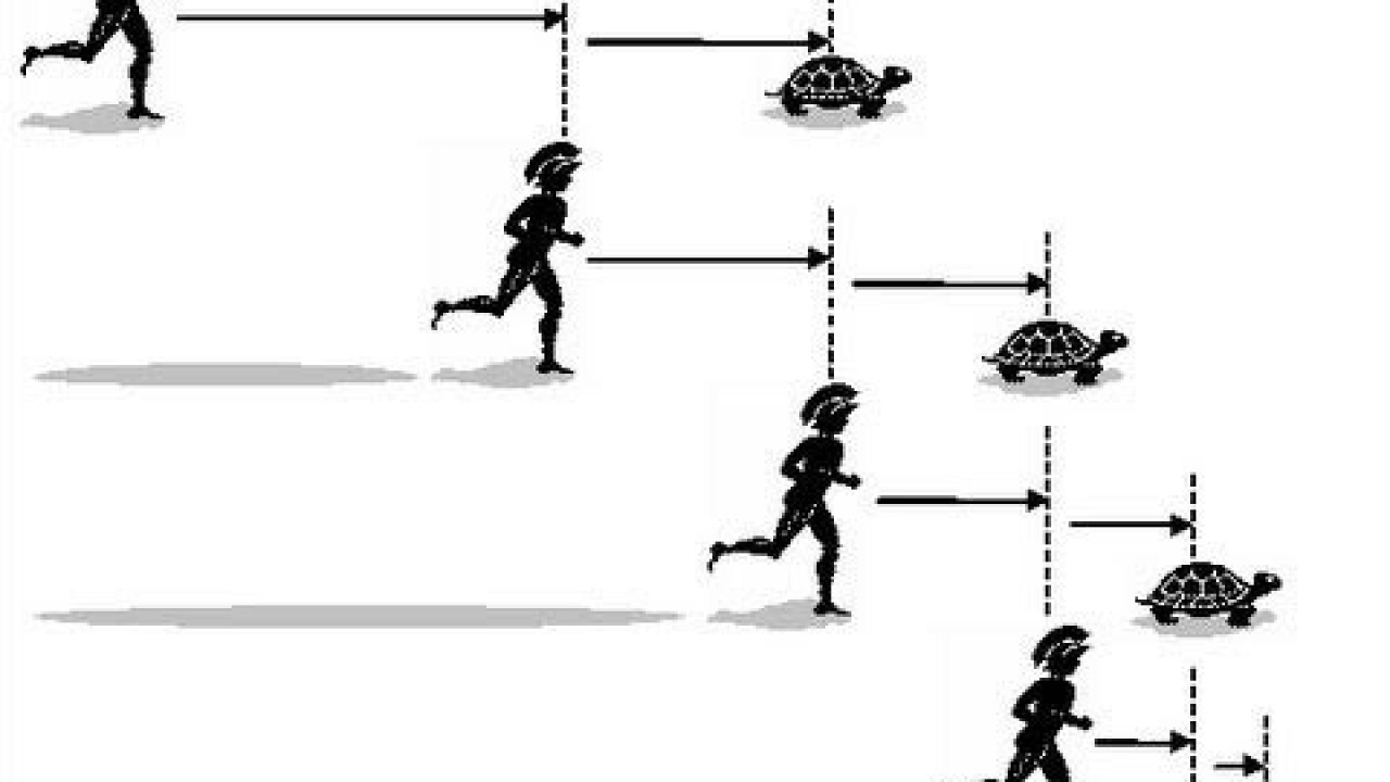 다른 역설은 아킬레우스와 거북의 경주인데, 이것도 내용은 비슷하다. 고대의 만능 스포츠맨인 아킬레우스보다 느림보의 대명사인 거북이가 조금만 먼저 출발해도 아킬레우스는 영원히 거북을 따라잡지 못한다. 아킬레우스가 거북이 있던 곳까지 달려가면 거북은 거기서 몇 걸음이라도 더 가 있다. 다시 아킬레우스가 접근하면 거북은 걸음을 아예 멈추지 않는 한 아주 조금이라도 앞서간다. 이런 운동이 아무리 되풀이되어도 아킬레우스는 결국 거북에 뒤처질 수밖에 없다.