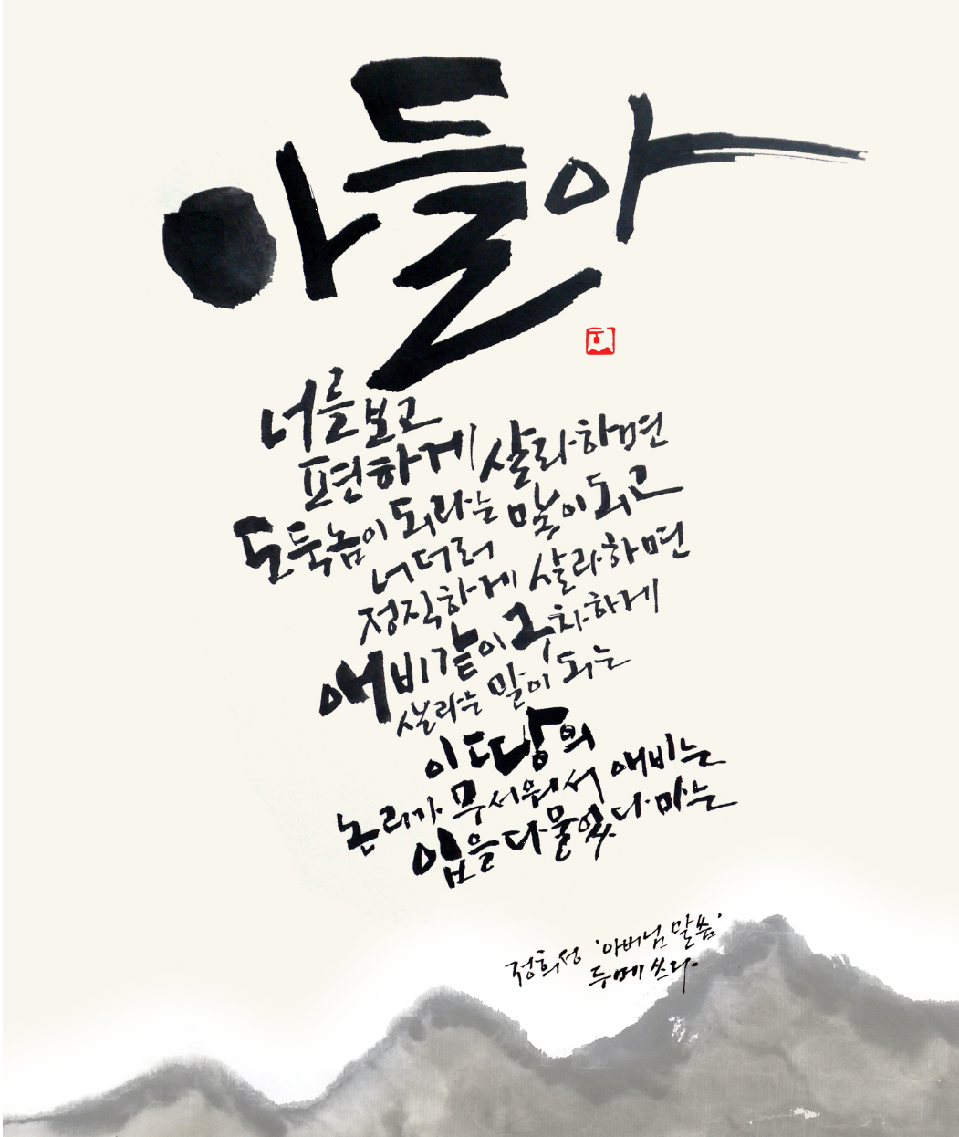 “아들아 너를 보고 편하게 살라 하면 도둑놈이 되라는 말이 되고 너더러 정직하게 살라 하면 애비같이 구차하게 살라는 말이 되는 이 땅의 논리가 무서워서 애비는 입을 다물었다마는……-정희성, 「아버님 말씀」”