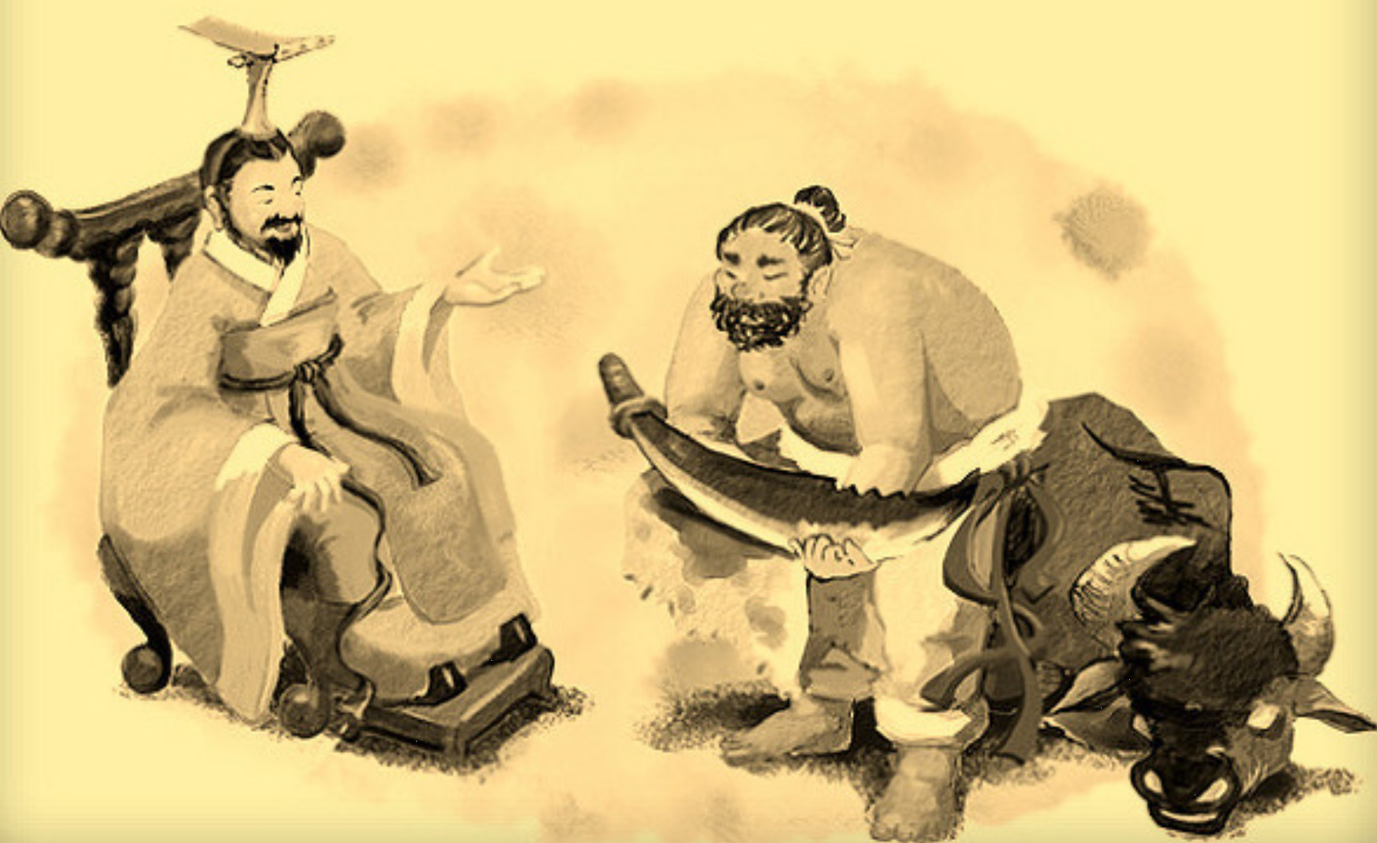 포정이라는 훌륭한 요리사가 문혜군을 위하여 소를 잡았다. 손을 갖다 대고, 어깨를 기울이고, 발을 디디고, 무릎을 굽히고, 그 소리는 설컹설컹. 칼 쓰는 대로 설뚝설뚝. 완벽한 음률, 무곡 「뽕나무 숲[桑林]」에 맞춰 춤추는 것 같고, 악장 「다스리는 우두머리[經首]」에 맞춰 율동하는 것 같았다.