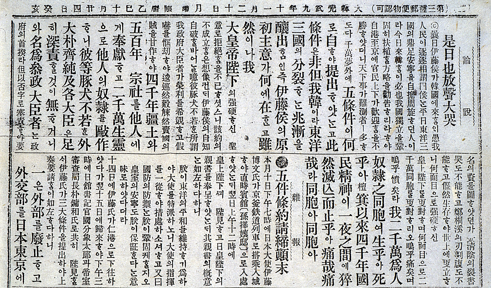 이 시는 일본 침략의 부당성을 공표하기 위하여 미국으로 가려다가 뜻을 이루지 못하고 일본에 머무르던 중 을사조약이 체결되었다는 소식과 장지연(張志淵)의 「시일야방성대곡(是日也放聲大哭)」이라는 사설을 보고 쓴 작품이다. 일본의 협박으로 조약이 체결된 상황에서 대신들이 보여준 나약한 모습과 매국노들의 파렴치한 행위를 극렬하게 비판하고 있다. 동시에 이들과 한규설(韓圭卨)의 비분강개하는 충정을 대비시켜 조선인의 의기가 살아있음을 천명하고 있다.