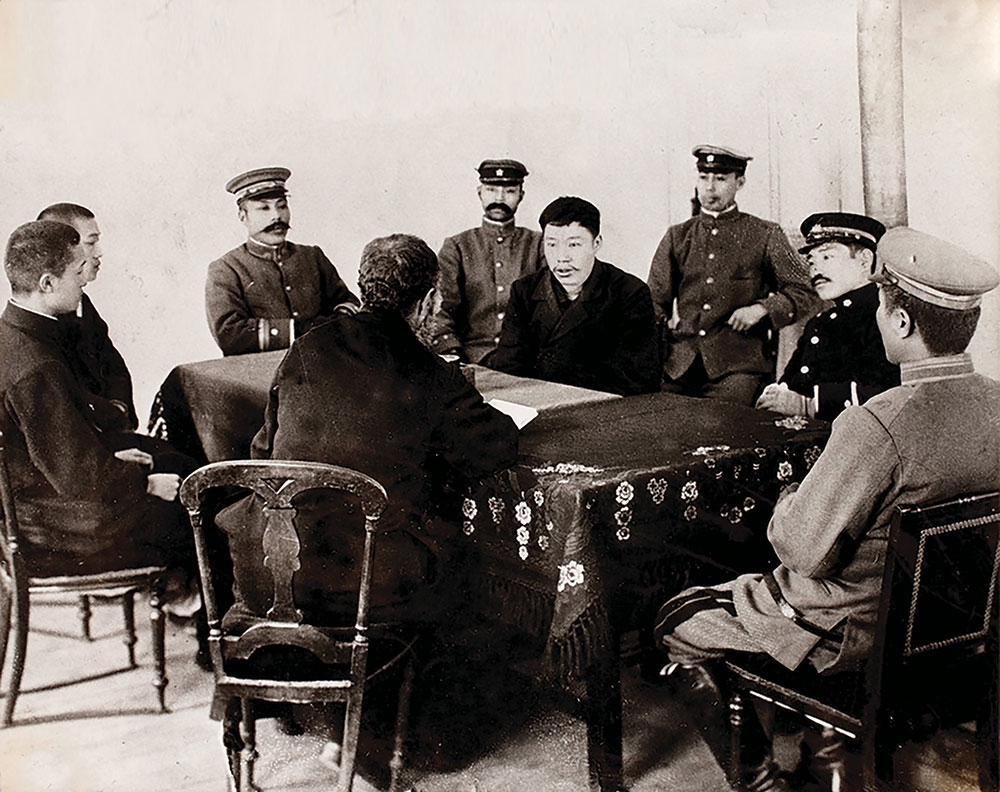 블라디보스토크 항구 하늘에서 송골매 맴돌다가 하얼빈 가에서 권총을 쏘아 벼락불을 터트렸다. 얼마나 많은 육대주 호걸들이 모두 깜짝 놀라 동시에 수저를 떨어뜨렸을까?