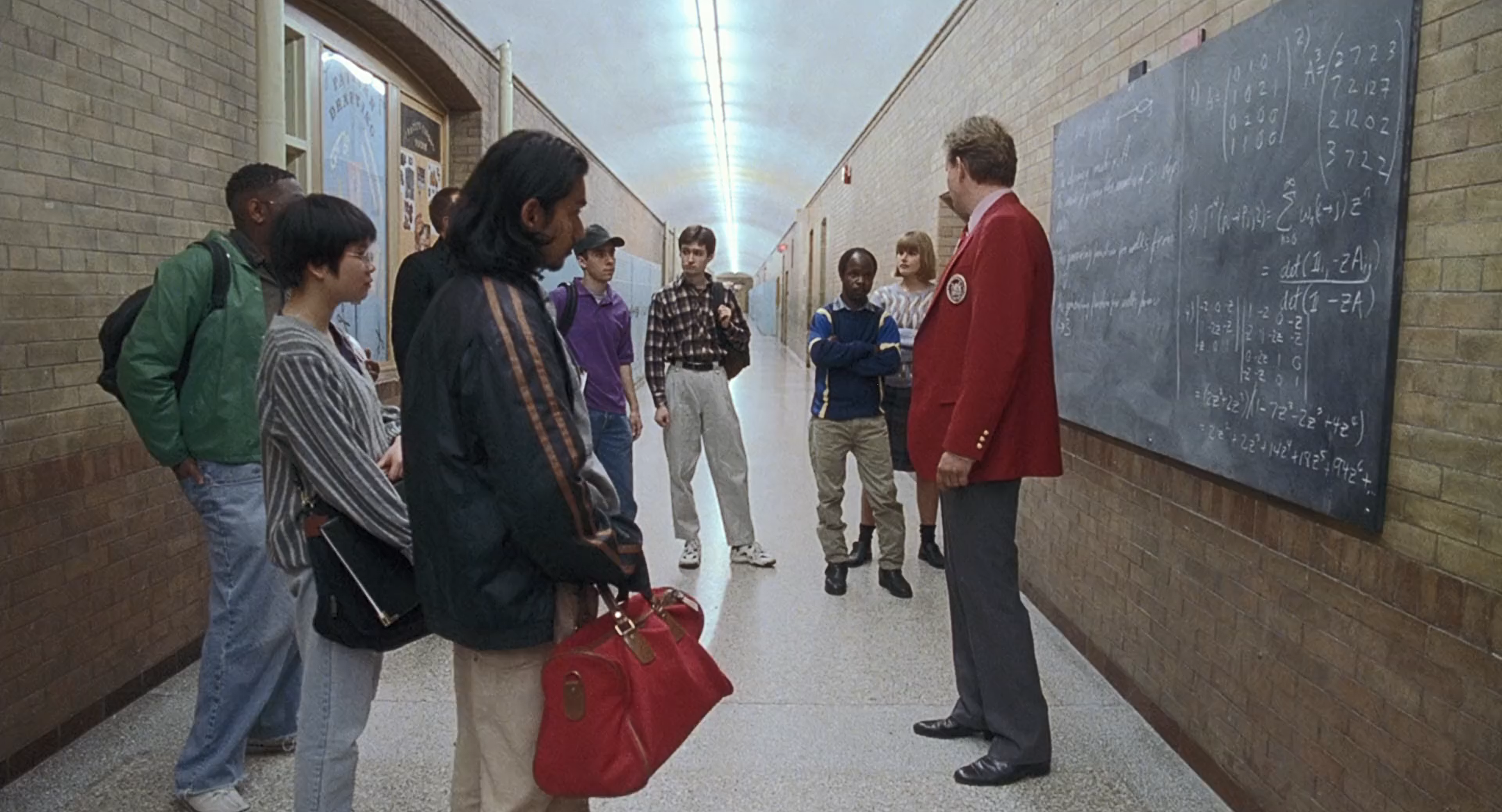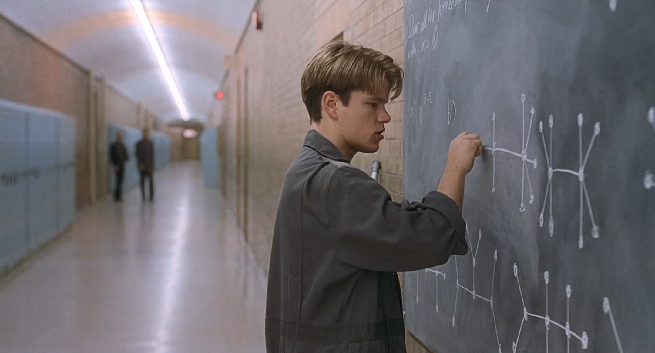 영화의 첫 장면. MIT 대학 교실은 대학원생들로 가득하다. 램보 교수(스텔란 스카스가드)는 수학계의 노벨상이라 불리는 수학 수훈상 수상자답게 호기롭고 당당하다. 그는 수업을 마치며 학생들에게 과제를 낸다. “본관 복도 칠판에 푸리에 이론(Fourier Theory)을 적어뒀으니, 누구든 학기 말까지 풀어주기 바란다. 그걸 푼 사람은 내 수제자로서 명예와 부를 얻게 될 것이며 그 성과가 기록되고 영예로운 MIT 테크지에 이름이 오르게 될 것이다.” 그러나 학생들은 시큰둥하다. 아무리 부와 명예가 좋다지만 워낙 어려운 문제라 자신이 풀어낼 리가 없다는 얼굴들이다. 수업이 끝난 후. 청소부 윌(맷 데이먼)은 칠판에 적힌 문제를 물끄러미 바라본다. 윌은 언제나처럼 청소기로 복도를 청소하다가 칠판 위에다 뭔가를 끼적인다.
