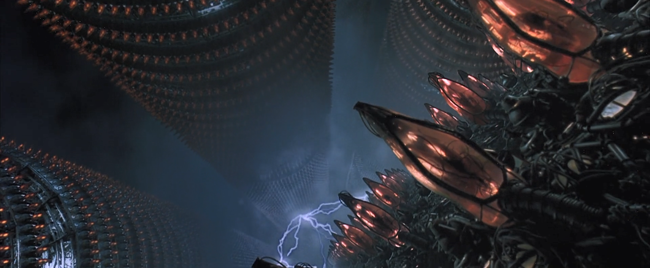 모피어스: 인류는 생존을 위해 기계에 의존했어. 운명이란 모순적일 때가 많아. 인체는 120볼트 이상의 전기를 발생시키고 체열은 2만 5천 BTU가 넘어. 인간들은 끝도 없이 널려 있잖아. 인간은 태어나는 게 아니라 사육되는 거지. 나도 오랫동안 믿지 못했어. 그러다가 직접 본 거야. 죽은 자를 액화시켜 산 자에게 주입하는 걸! 끔찍하리만치 정확한 기계들을 보면서 난 명백한 진실을 깨달았지.