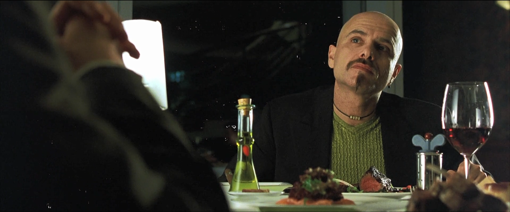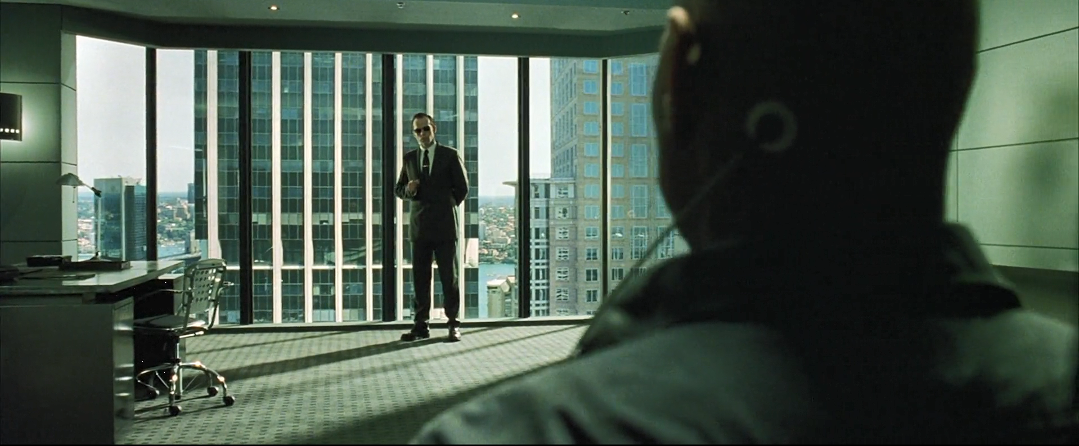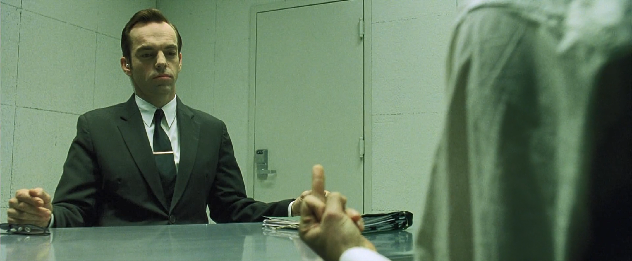스미스: 우린 한동안 자넬 지켜봐왔다. 두 개의 인생을 살고 있더군. 하나는 소프트웨어 회사의 프로그래머인 토마스 앤더슨. 떳떳한 시민으로서 세금도 내고 집주인 아줌마의 쓰레기도 버려주지. 다른 하나는 네오라는 이름의 해커로서 온갖 컴퓨터 범죄는 죄다 저질렀더군. 둘 중 하나는 앞날이 보장돼 있고 다른 하나는 미래가 없어. 아직 솔직하게 털어놓겠네. 우린 자네가 필요해. 어떤 자가 연락해왔지? 모피어스라는 자 말이야. 그에 대해 자네가 아는 건 전부 무시해. 정부에서도 그자를 가장 위험한 인물로 찍었으니까. 동료들은 내가 자네 일로 시간낭비를 한다고 봐. 하지만 난 자넬 믿네. 자네가 새 출발을 하게 도와 줄 수도 있어. 자넨 테러범 체포를 도와주기만 하면 돼.