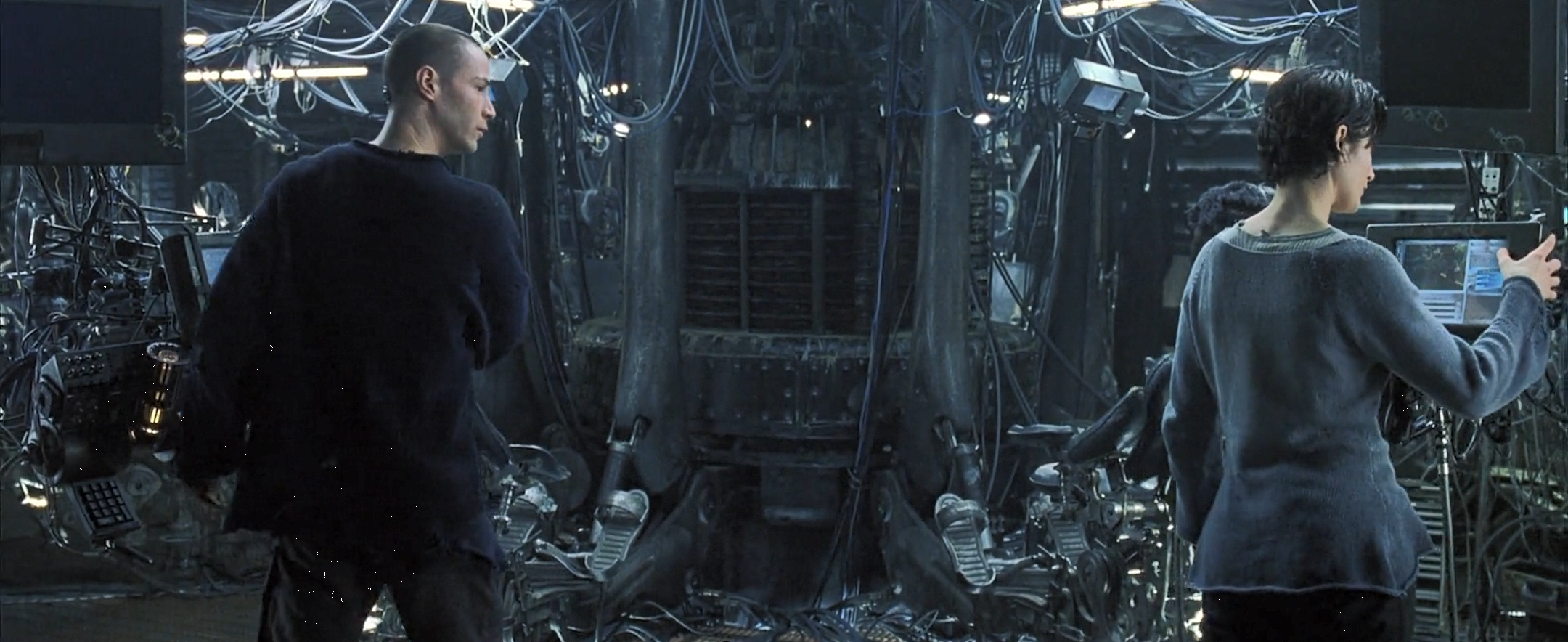모피어스는 지금까지 네오가 ‘현실’이라고 믿었던 모든 세계가 ‘가상’이었다고 선언한다. 그는 인류가 AI인공 지능 컴퓨터 제조 기술을 갖게 된 것에 스스로 경탄하면서 AI의 탄생을 자축했던 시절이 있었다고 이야기한다. 그러나 인간의 일을 ‘대신’해주는 AI에 지나치면 의존하게 되면서 AI와 인류 사이에 권력의 균형이 깨져버린다. AI와 인류 사이에 전쟁이 일어나고 승리는 AI의 몫으로 돌아간다. 그 과정에서 인간은 태양력으로 움직이는 AI들을 위협하기 위해 태양을 없애버렸다. 그리고 인간에게 승리한 AI들은 ‘인간’을 일종의 ‘건전지’로 사용하여 자신들의 생명을 유지하게 된다. 인간은 태양을 없애버리면 AI들이 멸망할 것이라 믿었지만 태양이 없어지자 AI들은 태양에너지 대체제로서 인간의 육체를 사용했다. 인간은 ‘대량 사육’되어 AI들의 건전지로 이용되고, 2199년 현재 인류가 꾸는 ‘꿈’이야말로 그들이 지금까지 현실이라 믿었던 유일한 세계(1999년)였다.