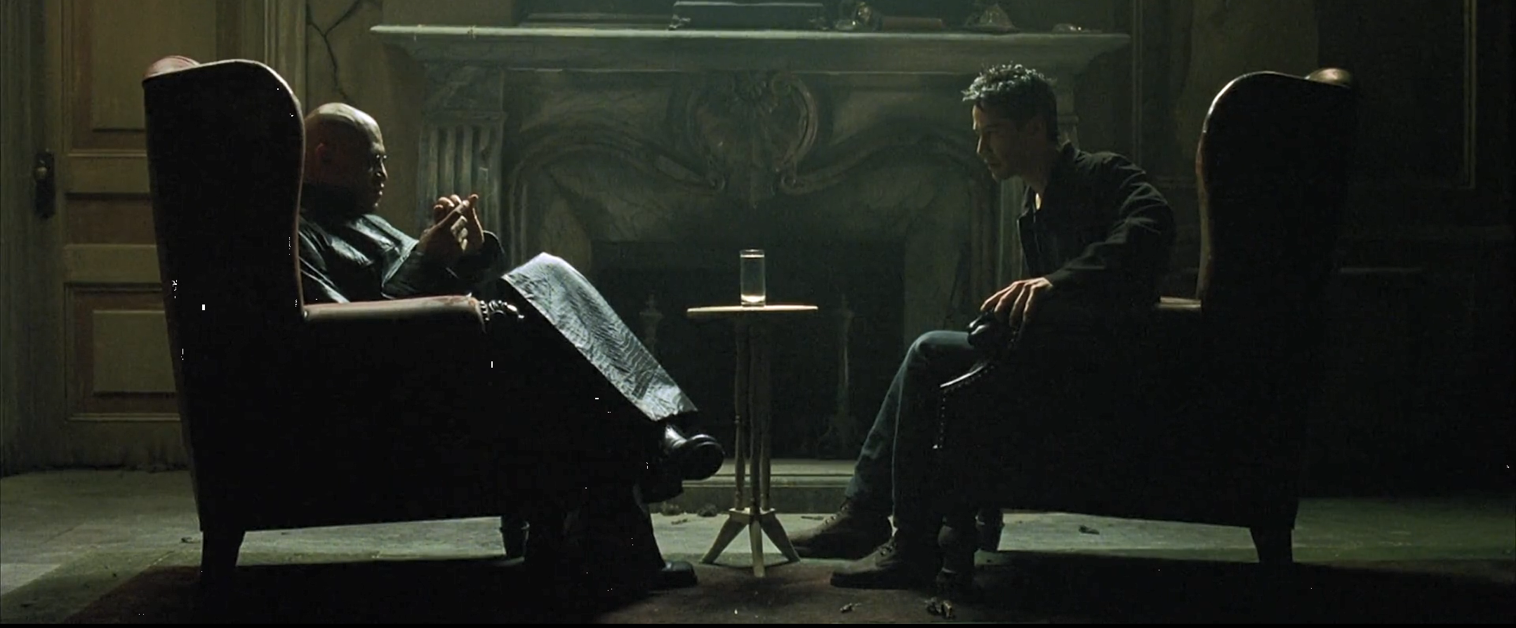 모피어스: 네가 노예라는 진실! 너도 다른 사람과 마찬가지로 모든 감각이 마비된 채 감옥에서 태어났지. 네 마음의 감옥. 불행히도 매트릭스가 뭔지 말할 순 없어. 직접 봐야만 해. 이게 마지막 기회다. 다시는 돌이킬 수 없어. 파란 약을 먹으면 여기서 모든 게 끝난다. 침대에서 깨어나 믿고 싶은 걸 믿게 돼. 빨간 약을 먹으면 여기 이상한 나라에 남아 끝까지 가게 된다.