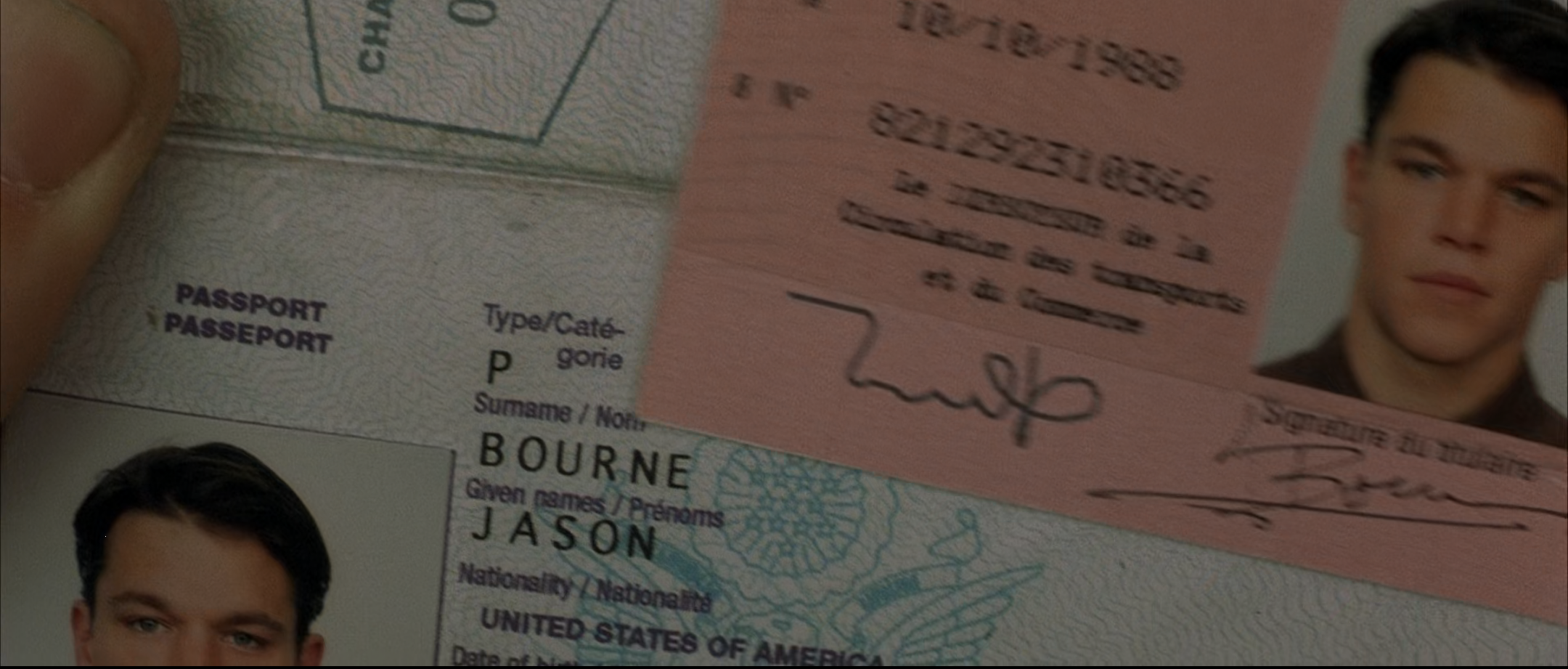 이름은 타인을 우리 두뇌 속의 ‘지인 목록’에 올리기 위한 첫 번째 구성 항목이다. ‘호명’을 함으로써 타인을 분석하고 때로는 지배하고 싶은 욕구를 숨기지 않는 대표적인 사례가 바로 ‘국가’다. 국가가 증명하는 개인의 정체성을 기록한 ‘여권’ 없이는 우리는 국가의 바깥 그 어디로도 도망칠 수 없다. 국가는 개개인의 이름과 생년월일, 태어난 장소 등의 ‘기본적인’ 정보를 통해 개인의 정보를 목록화하고 만약 그러한 정보가 국가의 정보망에 ‘기재’되지 않는다면 멀쩡히 살아 있는 한 사람도 ‘이 세상에 존재하지 않는 인간’이 되어버린다. 주민등록만 말소시키면 개인은 ‘어디에도 존재하지 않는 사람’이 되어버리는 것이다. 이때 정체성을 기재한 엄중한 ‘기록’들은 역설적으로 개개인의 생생한 실체를 ‘부정’하는 아이러니를 연출하는 것이다. 지중해 한 가운데서 등에 총상을 입은 채 표류하고 있던 이 이름 없는 사내가 의식을 되찾은 순간. 그가 맞닥뜨린 것은 낯선 어부가 발견한 난데없는 스위스 은행의 계좌번호다. 표류하고 있던 사내를 구해준 이탈리아 어부는 그의 몸속에서 작은 기계장치를 꺼내고 그것을 벽에 비추자 스위스 은행의 계좌번호가 나타난 것이다. “000-7-17-12-0-14-26. 게마인샤프트 은행, 취리히. 보시오, 은행 계좌 번호요. 이게 왜 당신 엉덩이에 있었던 거요?” 그는 아무 것도 기억할 수 없고 단지 등에 입은 총상과 엉덩이 속에 들어 있었다는 이 계좌번호만이 그가 살아온 ‘흔적’을 대변하고 있는 것이다.