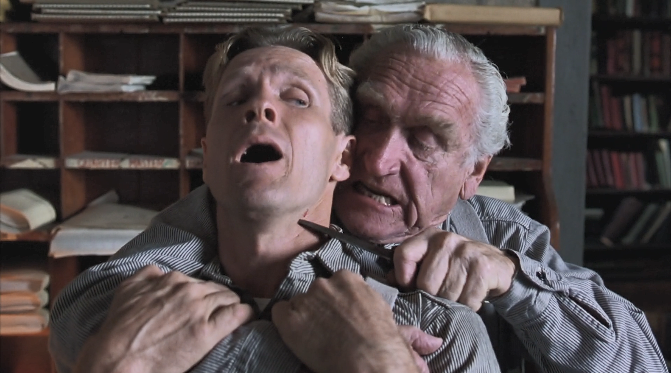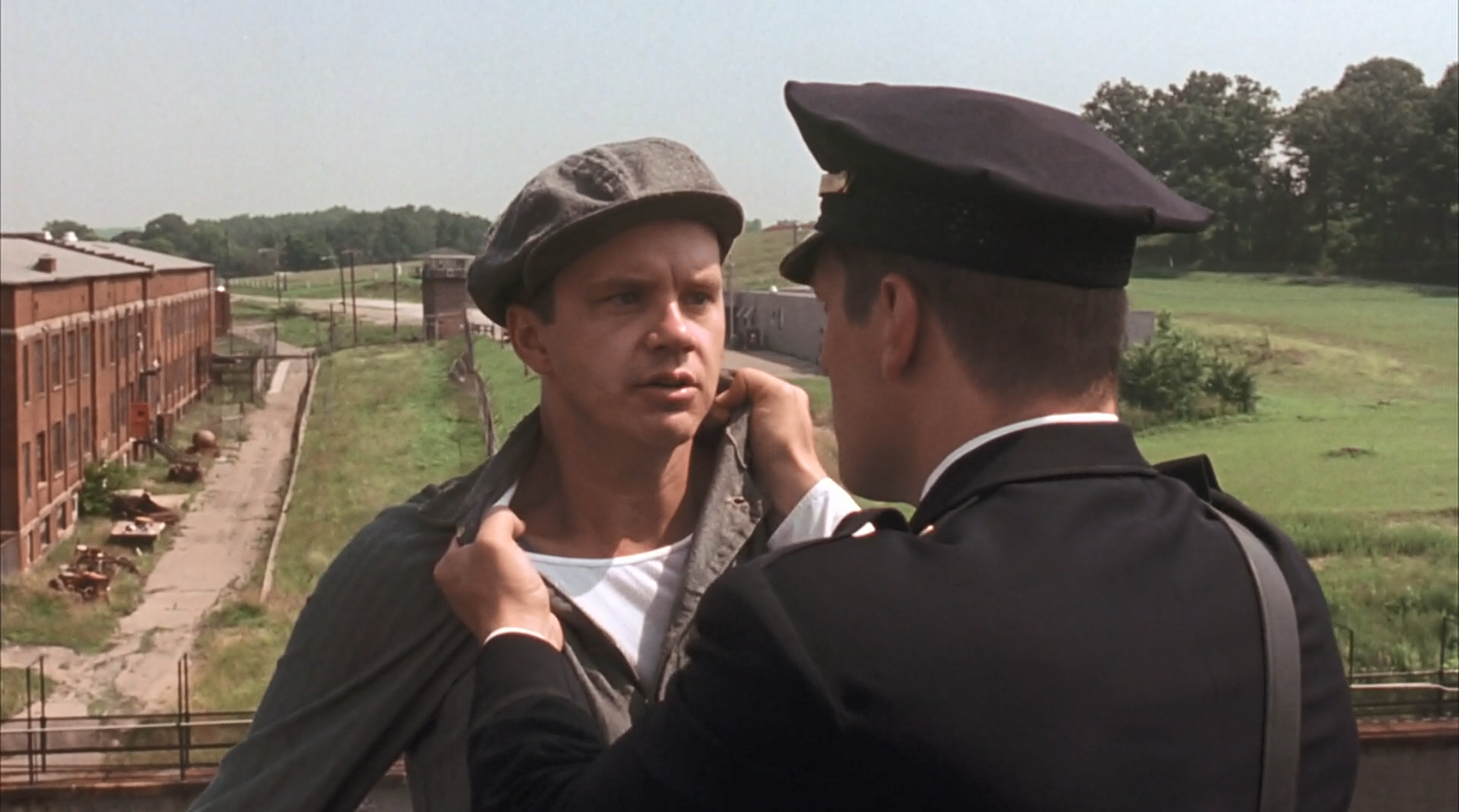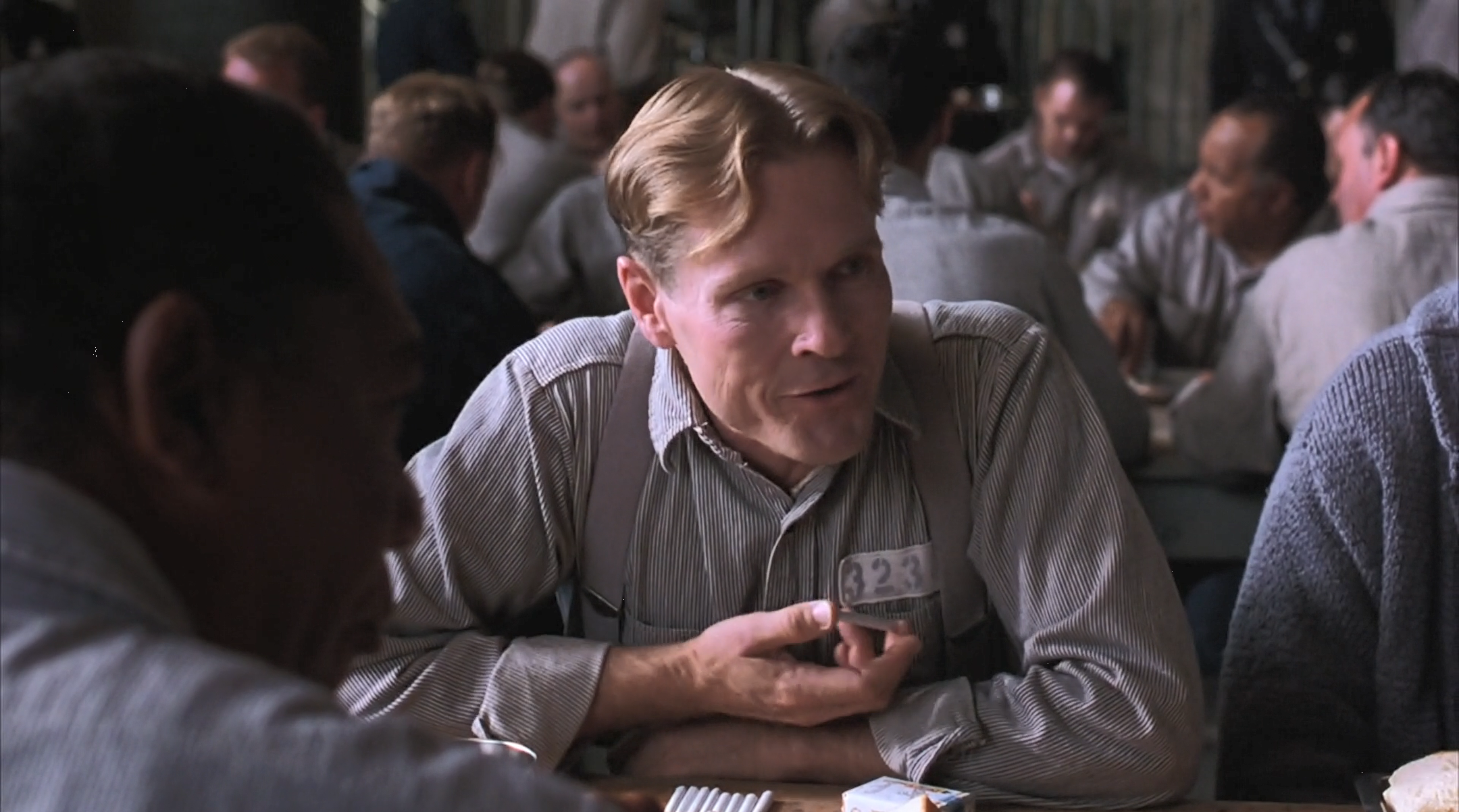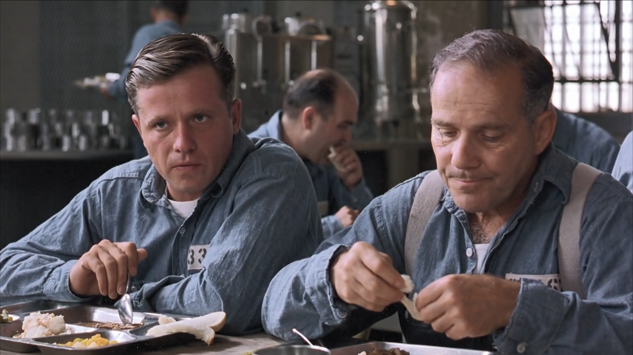 어느 날 레드와 앤디는 브룩스가 헤이우드의 목에 칼을 들이대고 있다는 믿을 수 없는 소식을 듣고 달려간다. 칼을 제대로 들고 있을 힘도 없어 보이는 브룩스는 정작 협박당하고 있는 헤이우드보다 더 두려운 표정으로 떨고 있다. “우리, 말로 하자고.” “할 말 없어. 목을 그어 버릴 거야.” “헤이우드가 뭘 잘못했어?” “그건 상관없어. 난 이렇게 할 수밖에 없어.” 앤디는 침착하게 브룩스를 설득한다. “브룩스, 헤이우드를 해치지 않을 거죠? 그도 브룩스를 해치지 않을 거예요. 왜 친구를 죽이려는 거죠? 날 봐요. 브룩스, 그거 내려놔요. 목을 봐요. 피가 나잖아요.” 브룩스의 날 선 눈빛은 앤디의 애정 어린 몇 마디 문장으로 무너져버린다. “이 길밖에 없어. 난 여기 있고 싶어.” 브룩스는 눈물을 흘리며 칼을 떨어뜨리고 죄수들은 가슴을 쓸어내린다. 사면을 받아 감옥을 나가게 된 브룩스에게 ‘잘 가’라고 인사한 죄밖에 없다는 헤이우드는, 억울해 미칠 것 같다는 표정으로 ‘브룩스가 미쳤다’고 투덜거린다.